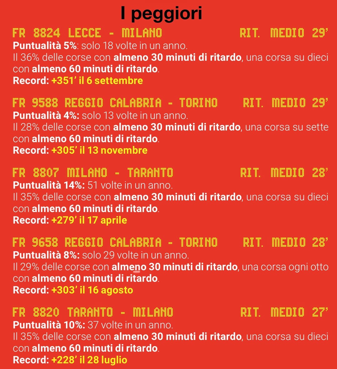 Ora i treni non sono fantastici eh, ma considerare ritardo che quelli che arrivano 1 minuto dopo non mi sembra utile, se no poi per evitare di far figurare questo ritardo allungano i tempi di percorrenza dichiarati, con danno per tutti.