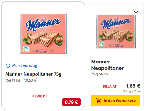 Rewe eig. gar keine Mannerschnitten anbietet, sondern nur als Angebotsware zu manchen Zeiten- Für Manner geht man in DE vor allem zu Edeka. Bei Edeka sind sie teurer als bei Billa (bin häufig in AT und DE und hab da immer einen direkten Vergleich).