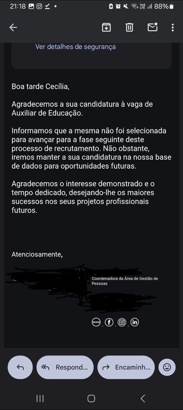 Esse email é a típica mensagem que o RH envia para as pessoas…e essa história de manter os dados no sistema para uma possível contratação é conversa de merda …