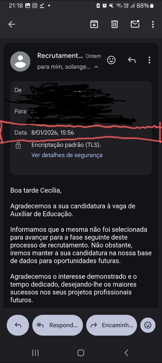 In sintesi la situazione è questa: ho aderito ad un’offerta di lavoro per la quale possiedo titoli di studio, formazione ed esperienze professionali pluriennali nonché le competenze per svolgerle, con sede di lavoro vicina alla mia zona di residenza. Ho attraversato due fasi di reclutamento, la seconda è stata una valutazione psicologica il 01/07/2026 dove, proprio all’inizio, mi è stato detto che non ci sarebbero state risposte giuste o sbagliate alle domande imbarazzanti che mi venivano poste e alle quali dovevo rispondere in modo umiliante perché avevo bisogno di un lavoro. In data 01/08/2026 ho ricevuto una mail che mi informava che non ero stato selezionato ma che la mia candidatura sarebbe stata tenuta in banca dati per future opportunità ed infatti in un futuro molto prossimo, praticamente lo stesso giorno del 01/08/2026 l’ente ha inserito un nuovo annuncio di lavoro per la posizione per la quale mi ero candidata e per la quale ero stato chiamato per due colloqui che mi hanno fatto solo sprecare risorse e sentire che erano "regno" con me. E questo è il mercato del lavoro portoghese dove si dice che i disoccupati sono quelli che non vogliono lavorare.