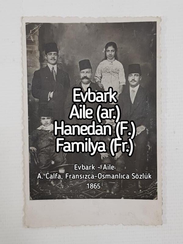 Quattro parole usate per “Famiglia” in turco ottomano. Lo scrittore armeno Ambroise Calfa menziona nel suo dizionario franco-ottomano del 1865 anche la parola Evbard dall’antico Eb turco + Corteccia.