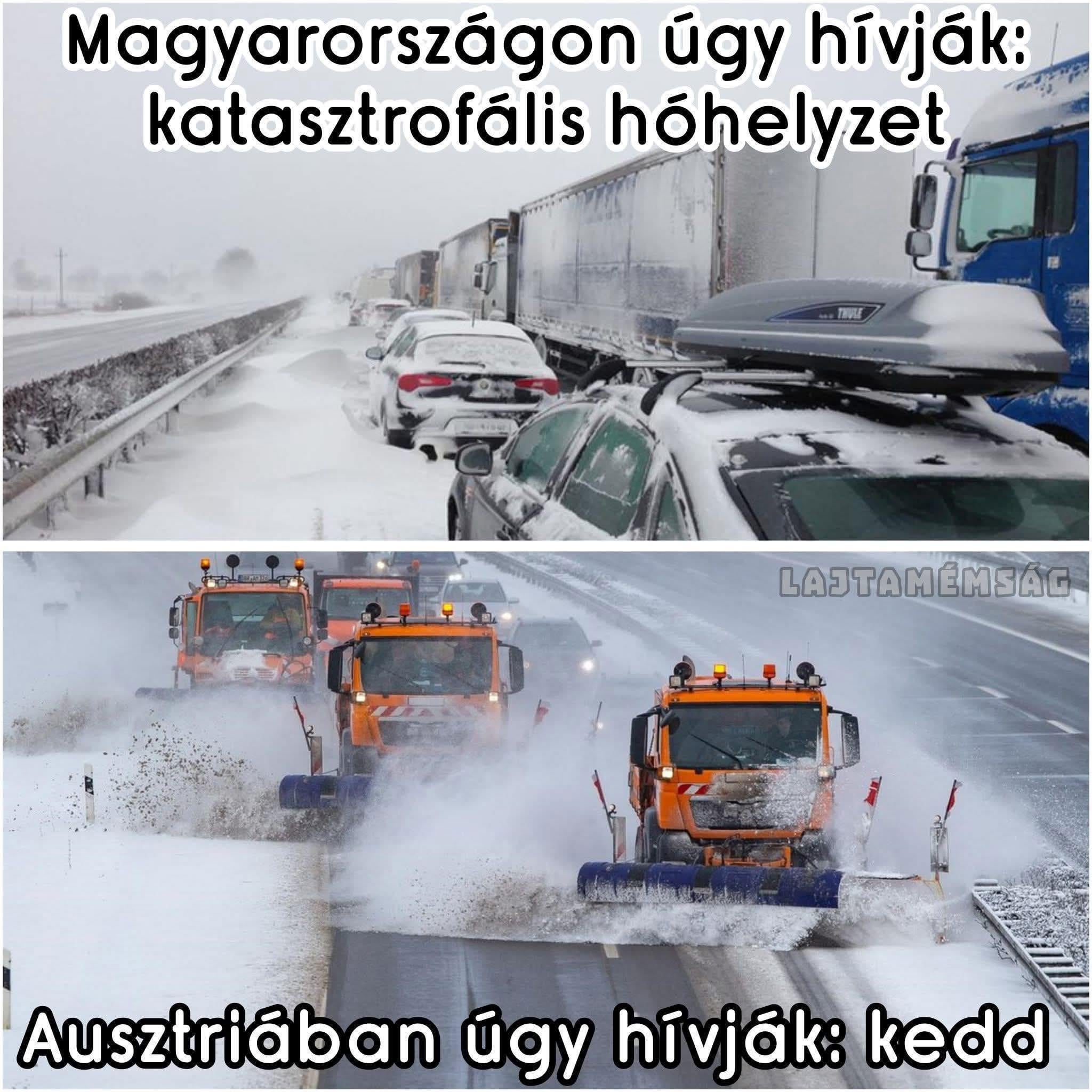 Az osztrák/német/”európai” MEGVÁRJA amíg jön a hókotró (egyébként joggal, mert JÖN! – nem úgy, mint nálunkfelé), besorol mögé és autózik.