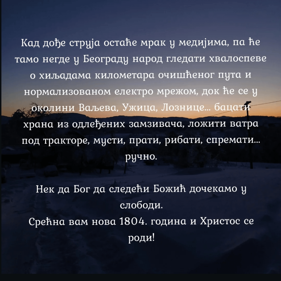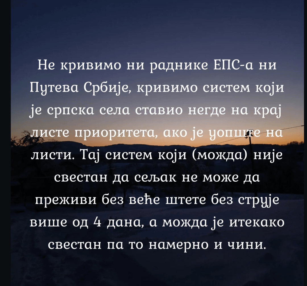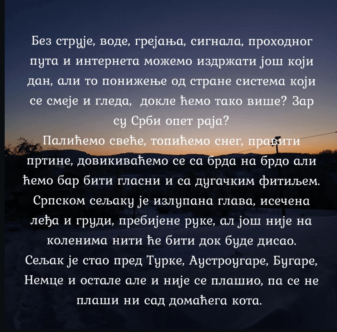 Puna podrška od seljaka iz valjevskog kraja trenutno u Beogradu. Ni moji nemaju struje, mada mi možemo da pređemo u stan u gradu jebiga.