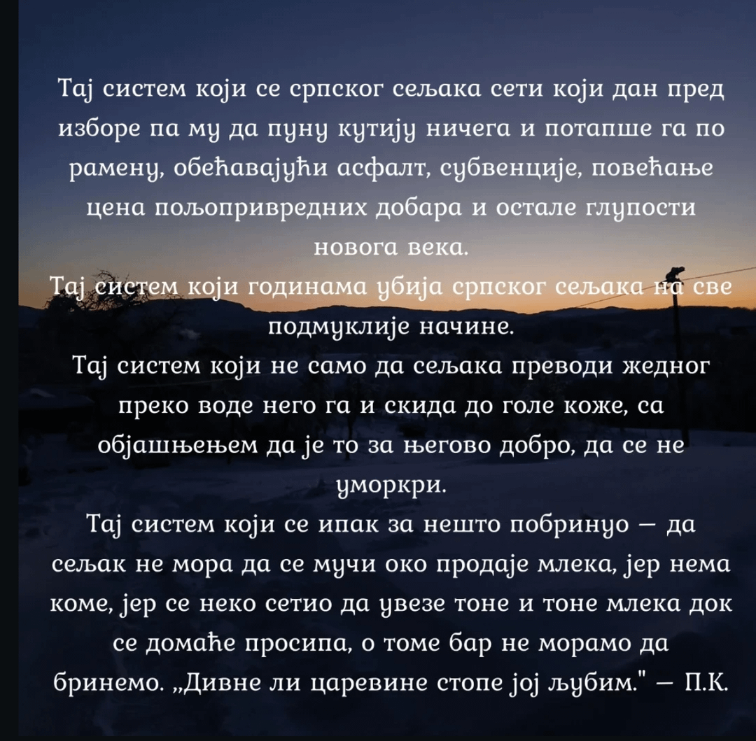 Znam se sa njegovima godinama, tu smo i slavu slavili i prvi maj i sve. Njegovi su za SNS, hvale se da je ceo zaseok uz V, a moj drug je “neutralan” i samo koluta očima ali glasao nikad nije.