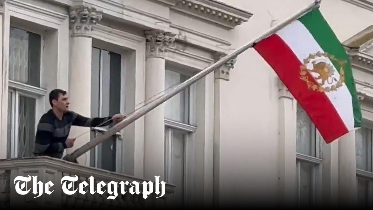 https://www.telegraph.co.uk/news/2026/01/10/protester-tears-down-iranian-regime-flag-london-embassy/