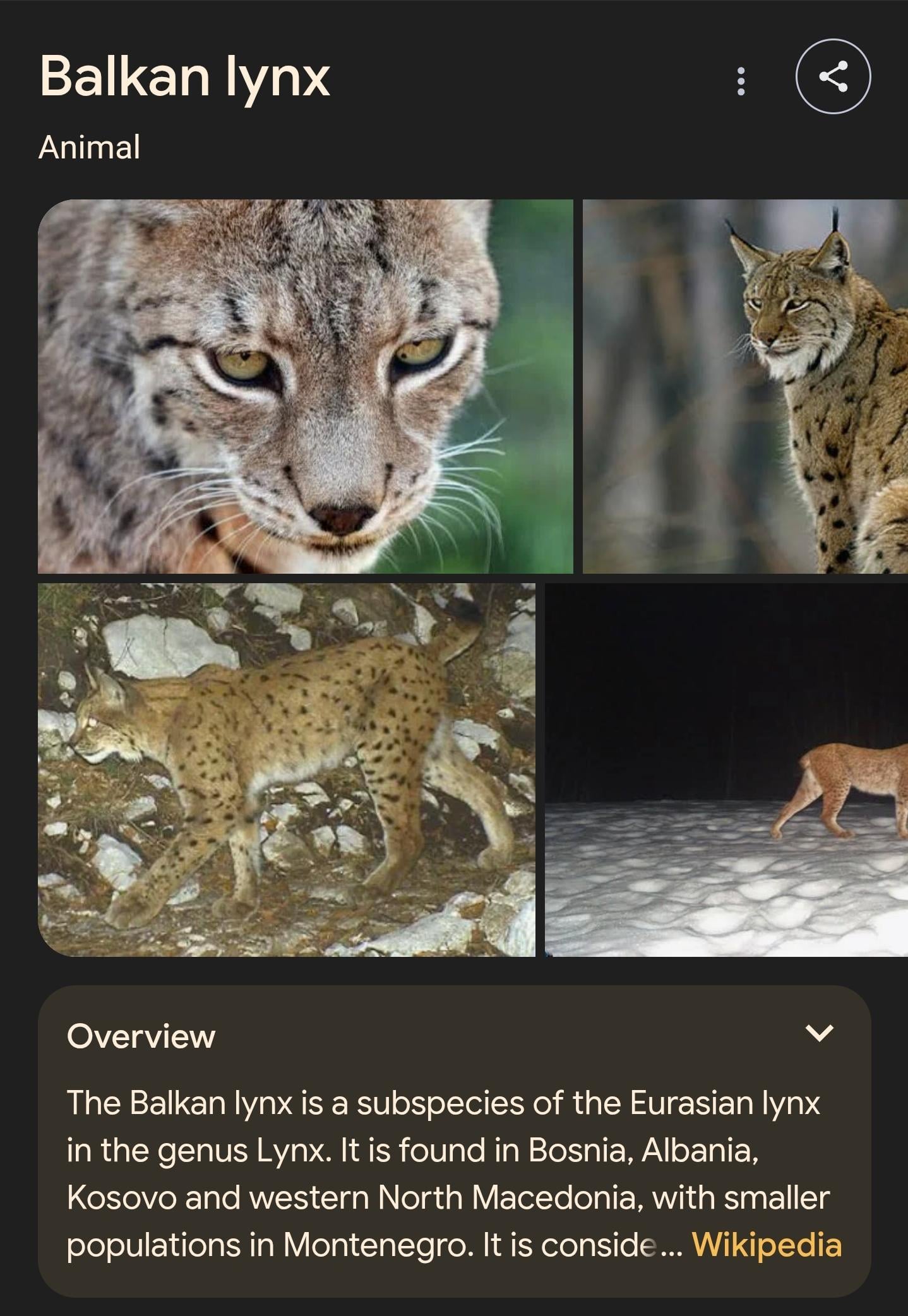 Ho visto in alcuni documentari la lince, che è una specie di gatto, e ho notato che c’erano anche in Albania, ma ne ho mai sentito parlare o nelle province dove vivono, ne conoscete qualcuno per curiosità