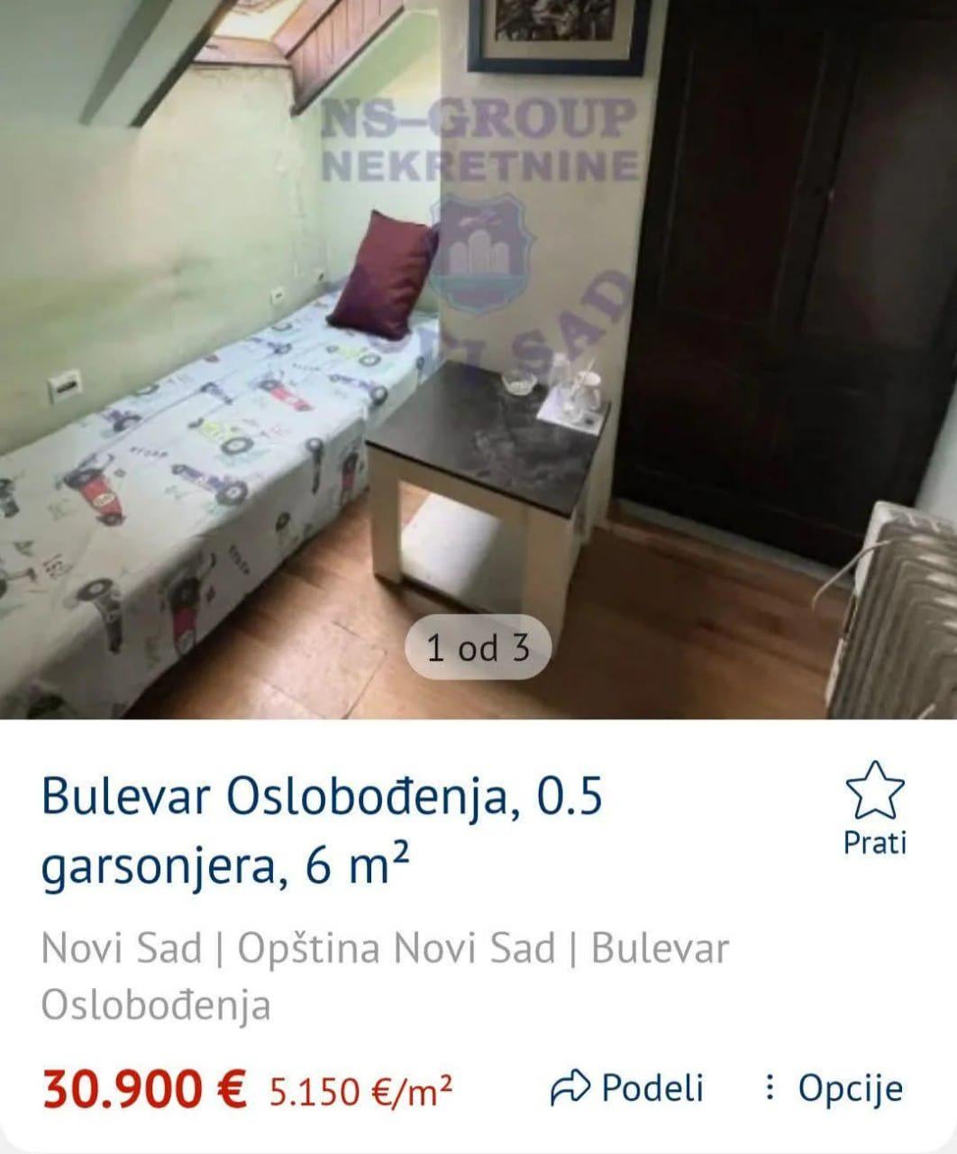 na dorćolu je lik prodavao “garsonjeru” od 9 m2 u kojoj su “kuhinja” = sudopera, pored nje “kupatilo” – wc šolja odvojena ZAVESOM od kuhinje i sobe (!), krevet i stolica za 70.000 €, a buđavo do te mere da nije moglo da se diše unutra!