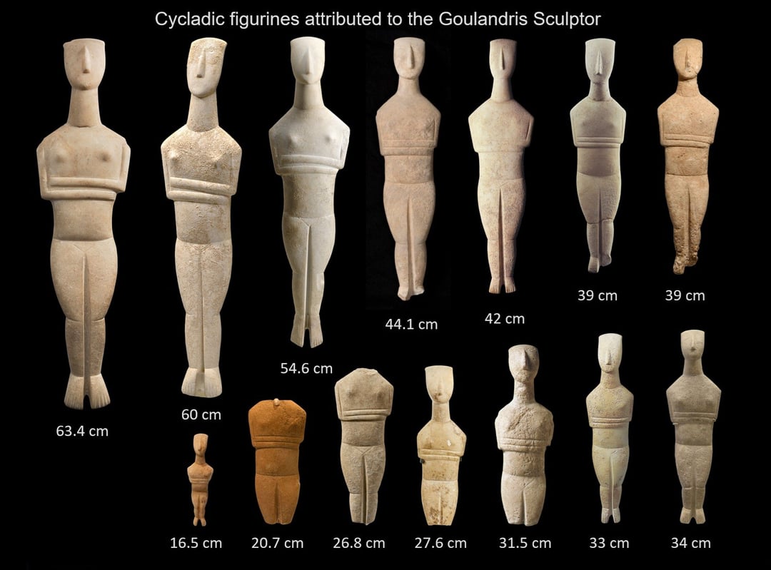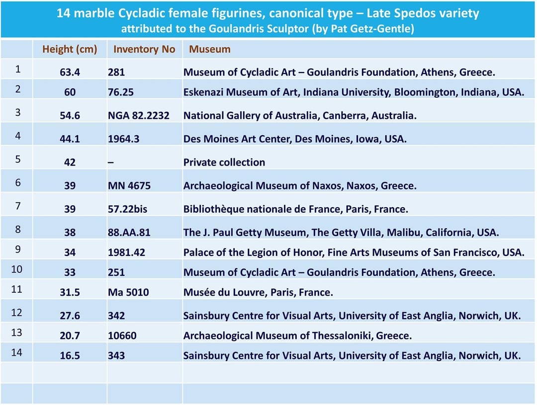 14 figurine femminili in marmo delle Cicladi, tipo regolare – variante Tardo Spade. attribuito allo scultore Goulandris (da Pat Getz-Gentle). Periodo proto-cicladico II, c. 2700 – 2300 a.C. (1500×1110)