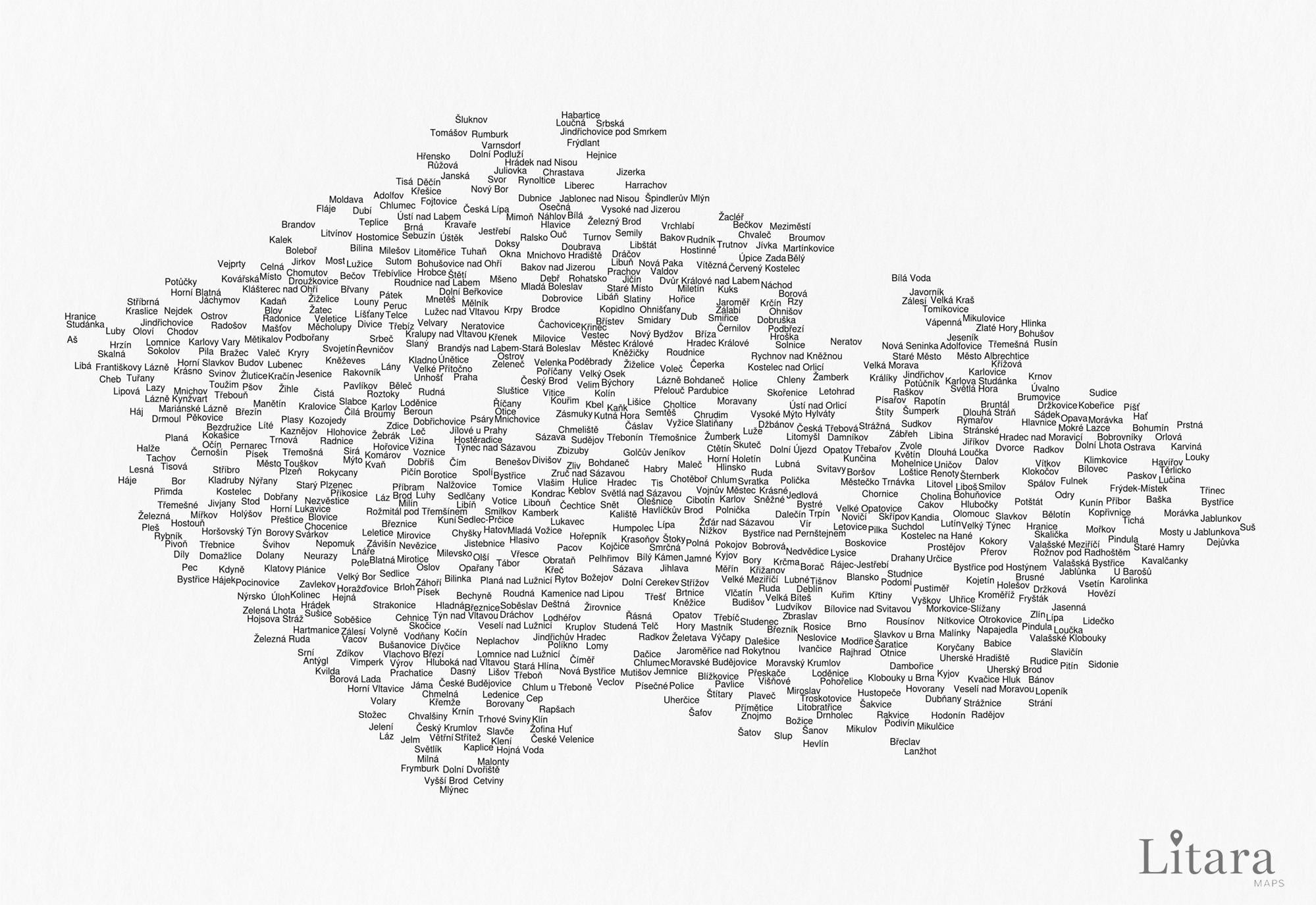 [OC] Ho creato una mappa tipografica della Repubblica Ceca utilizzando solo i nomi dei luoghi. / Ho creato una mappa tipografica della Repubblica Ceca utilizzando solo i nomi dei comuni.