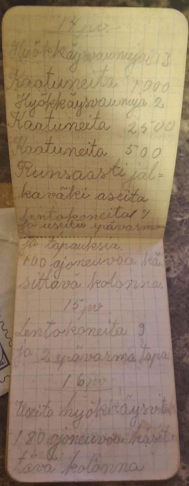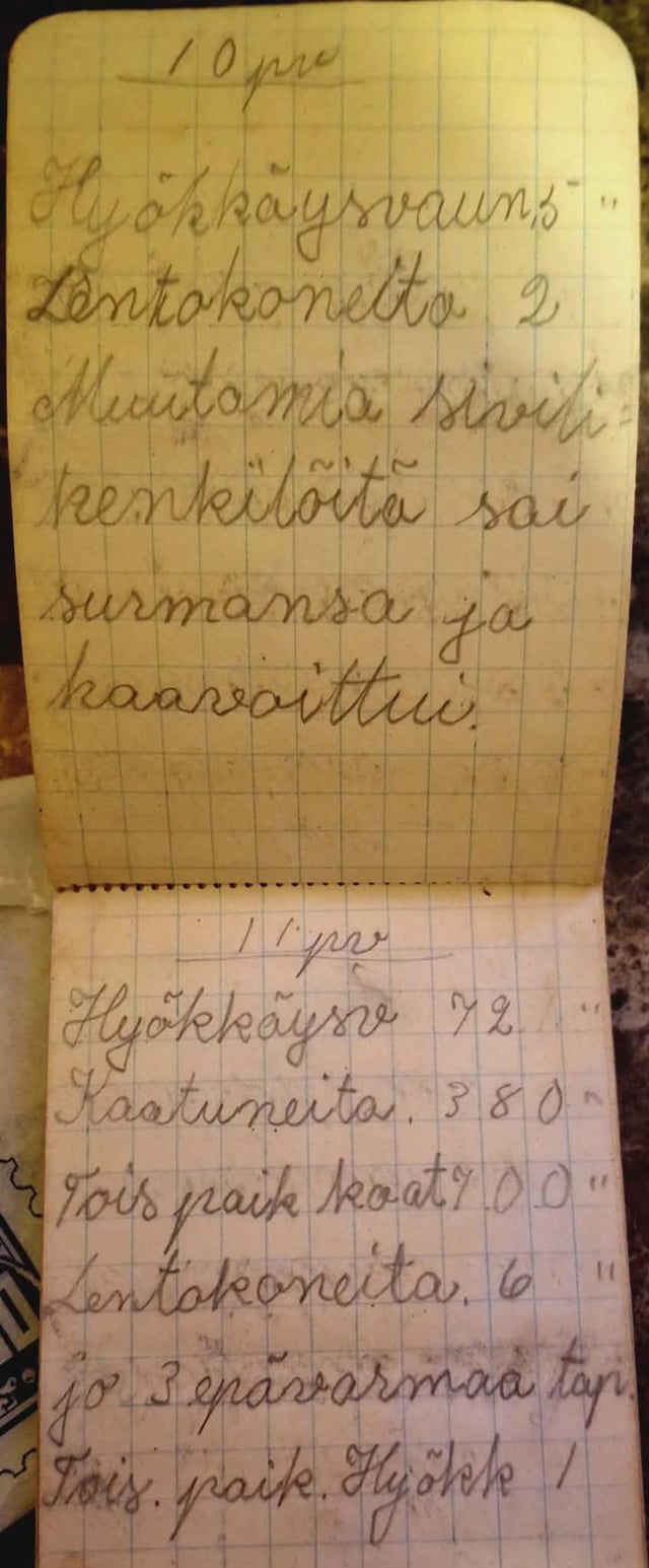 Il diario di mio padre del 1939. Ha vissuto in Finlandia ma è emigrato in Canada da adulto. Sarebbe stato un bambino in quel periodo, circa 12 anni? È morto nel 2012 ma la mia famiglia ha trovato questo. Non so leggere molto bene il finlandese, ma queste sono alcune foto del diario. Probabilmente non sono in ordine.