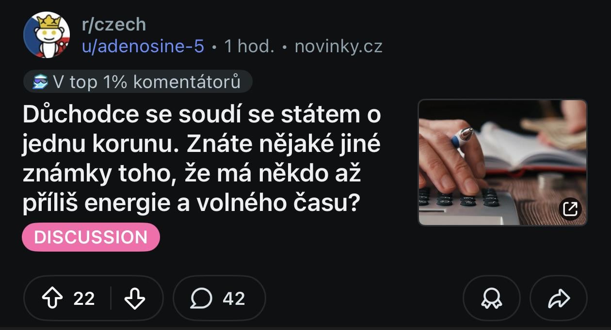 Redditor si stěžuje, že redditor si stěžuje, ze důchodce se soudí se státem o jednu korunu. Znáte néjaké jiné známky toho, že má někdo až příliš energie a volného casu?