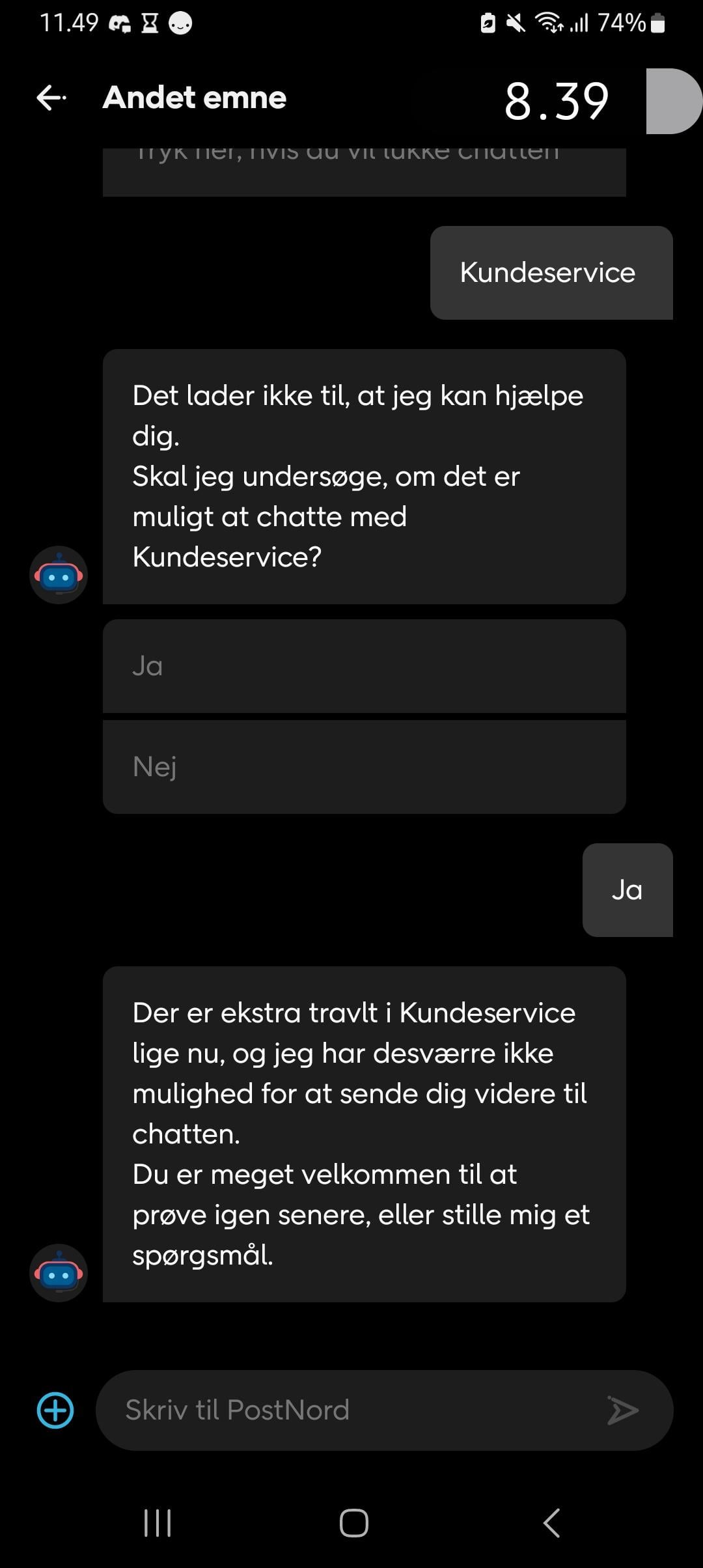 Det er så sindsygt at postnord har et telefonnummer der udelukkende eksisterer for at henvise til en App hvor man kan chatte med en uduelig chat-bot. Hvis man endelig kommer igennem forbi botten og chatter til et menneske i kundeservice, så er gennemsnitstiden på hver chat-besked i omegnen af 10 minutter. Man fører reelt en samtale hvor man skriver noget, og venter 10 minutter på et svar. Hvis man så taber tålmodigheden og ikke svarer inden for et par minutter, så lukker de chatten automatisk. PostNord er uden sammenligning den absolut værste aktør kundeservice-wise.