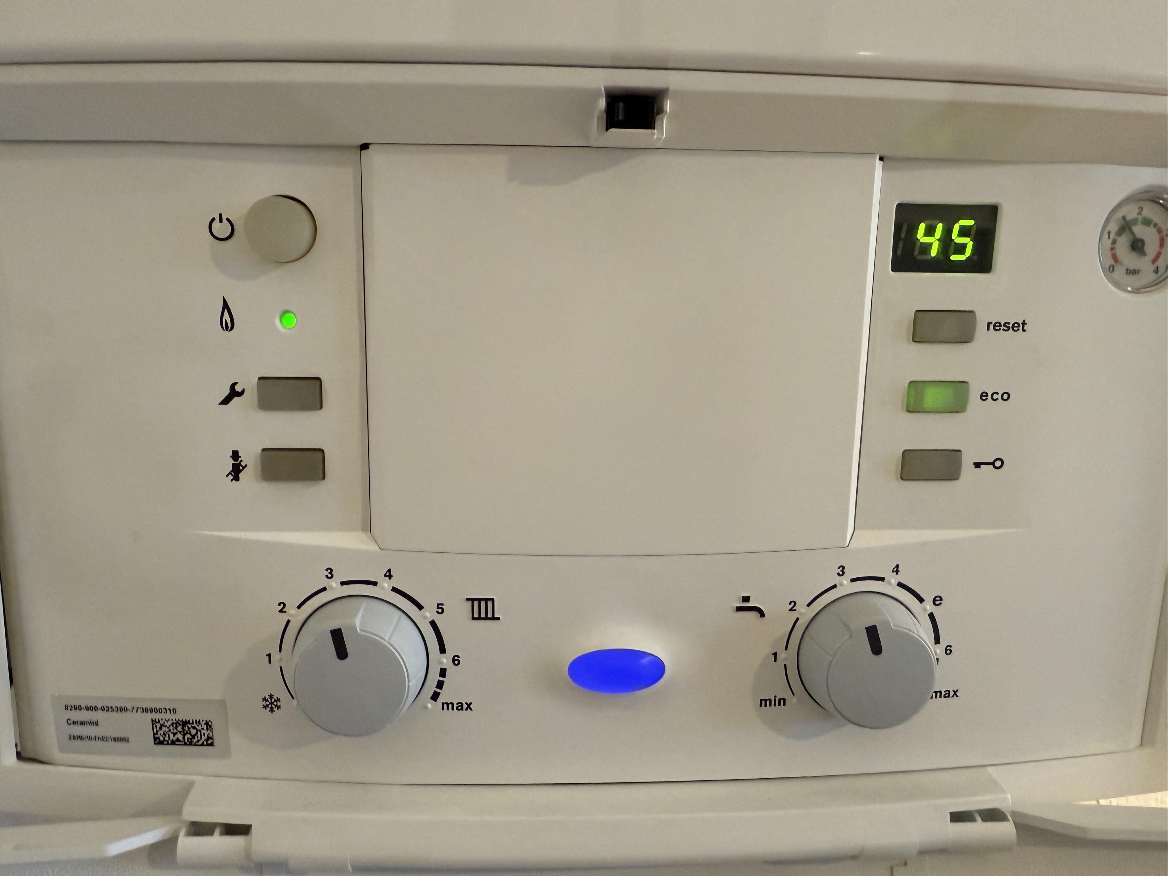 Also keep an eye on the top right gauge. If the needle is outside the green area, you need to either add (there should be a valve right below the unit where you can screw in a hose. Add water this way until the gauge is about 3/4 towards high pressure. Make sure to ventilate radiators after having it running for an hour or two after topping up)