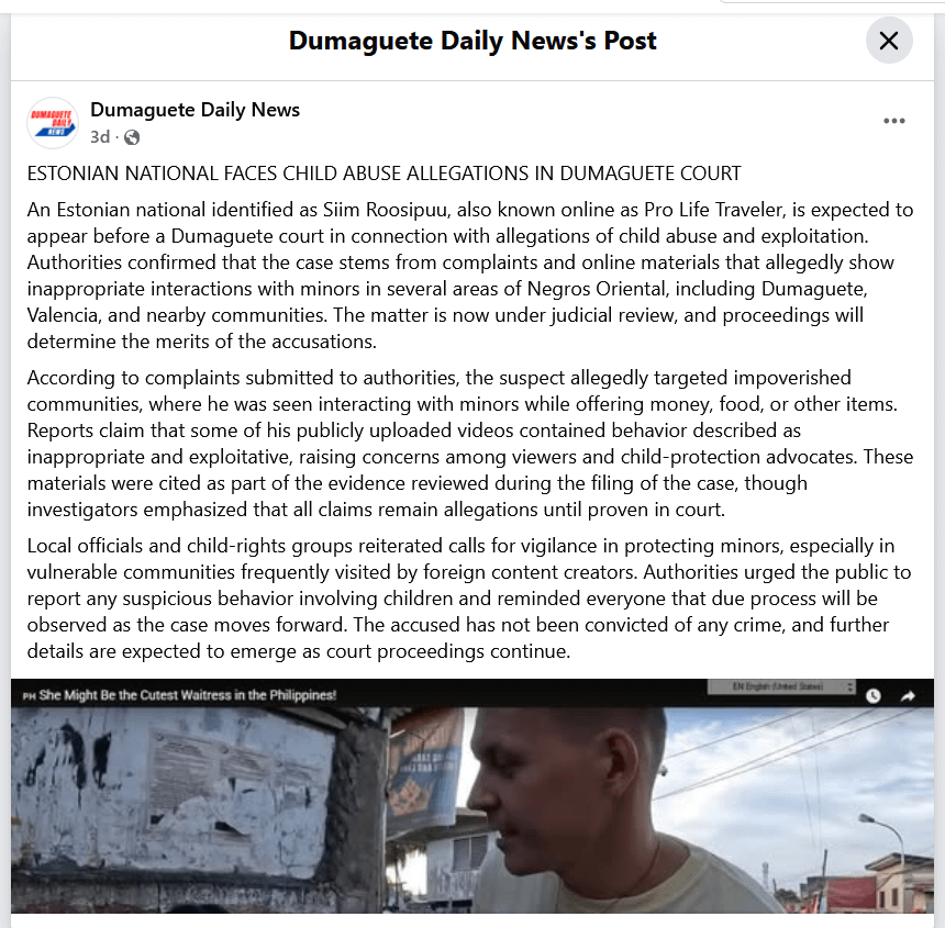 Il cittadino estone Siim Roosipuu, noto anche come Pro Life Traveller, dovrà comparire davanti al tribunale di Dumaguete con l’accusa di abuso e sfruttamento di minori. Le autorità hanno confermato che il caso deriva da denunce e materiali online che mostrano presumibilmente interazioni inappropriate con minori in diverse aree di Negros Oriental, tra cui Dumaguete, Valencia e le comunità vicine. La questione è ora sotto controllo giurisdizionale e il procedimento determinerà la sostanza delle accuse.