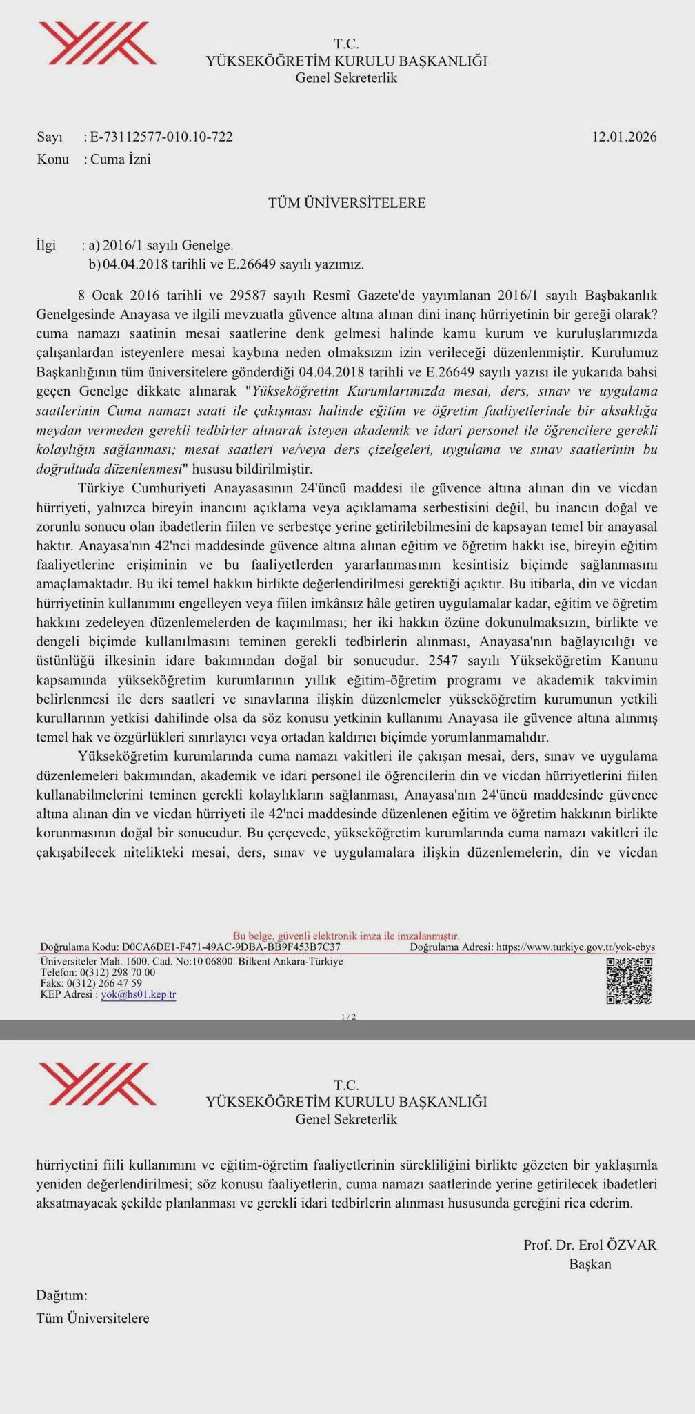YÖK ha inviato una lettera alle università riguardo agli orari di lavoro, alle lezioni e agli esami che coincidono con le ore di preghiera del venerdì, chiedendo loro di fornire le strutture necessarie per il personale accademico e amministrativo e gli studenti.