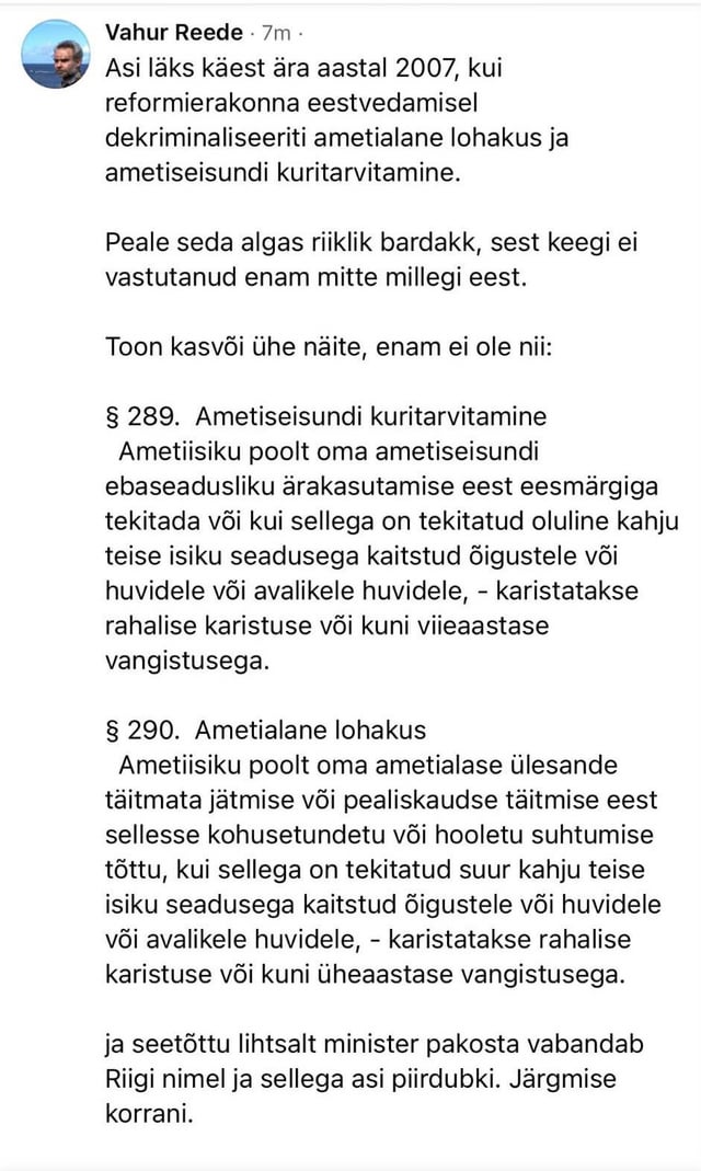 Mingi ekre trolli lalin. Seadust muudeti nii, et nende kahe paragrahvi all olnud asjad läksid muude puntide alla laiali, sest see tekitas segadust, et ametiseisundi kuritervitamine oli lahus kuriteost, mida sooritades seda tehti.