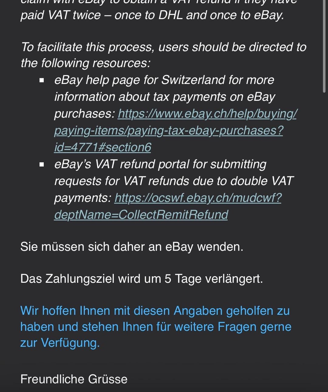 Overall ebay has completely fucked up the enforcement and **consistent** transmittance of invoice data and DHL is partially taking advantage by refusing to refund after evidence being provided, to a degree (unfortunately) rightly so because administratively the money is in Swiss tax people now.