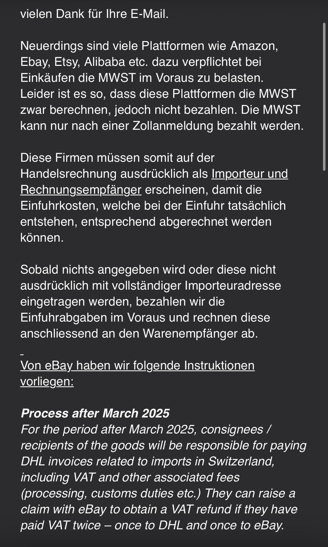 For the period after March 2025, consignees / recipients of the goods will be responsible for paying DH invoices related to imports in Switzerland, including VAT and other associated fees (processing, customs duties etc.) They can raise a claim with eBay to obtain a VAT refund if they have paid VAT twice – once to DHL and once to eBay.