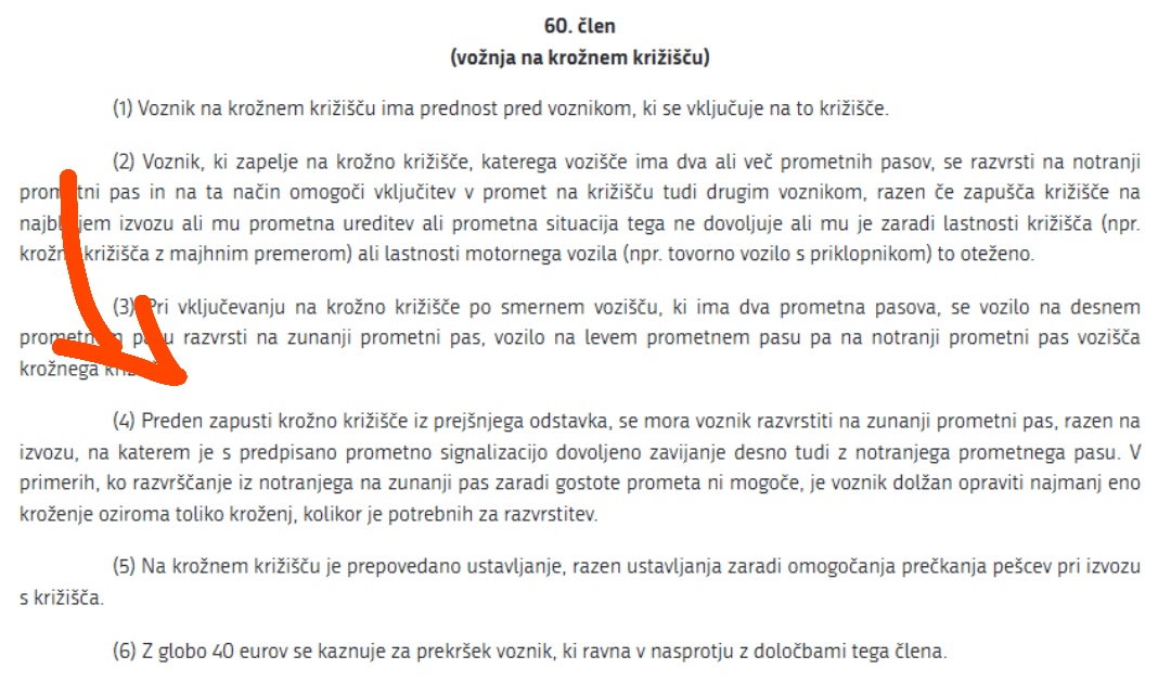 Jp, pa še to, da razvrstitev na zunanji pas ne pomeni, da iz notranjega pikiraš na zunanjega in direkt na izhod krožišča, ampak da se 1 izhod pred tvojim začneš razvrščat na zunanji pas (če je to možno, če ne narediš še en krog) in si pred tvojim izhodom že na zunanjem pasu, potem daš žmigavc in greš ven.