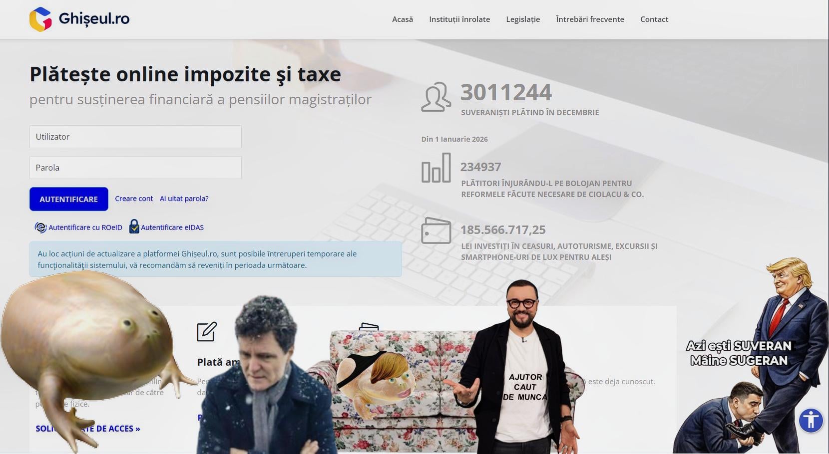 GeotheHSLord on 14/01/2026 08:45 La mulți și fericiți ani în 2026 și pe mai departe, dragii mei flăcăii <3 Nu uitați să vă plătiți taxele, că altfel ajungeți să rămâneți fără avion, [la fel ca presedintele nostru la Paris](https://www.g4media.ro/avion-zbor-nicusor-dan-paris-blocat-vreme-aeronava-c-27j-spartan-armata-romana.html). De asemenea, nu uitați să vă respectați superiorii, [așa cum fac sugeraniștii adevărați în fața „tătuțului” din America](https://www.reddit.com/r/Romania/comments/1qav38c/pai_da/?utm_source=share&utm_medium=web3x&utm_name=web3xcss&utm_term=1&utm_content=share_button). Domnul Cătălin Măruță nu a început anul prea bine, [trebuie să treacă pe la Direcția pentru Șomaj acum](https://hotnews.ro/pro-tv-emisiune-catalin-maruta-2148644). Asta deși locuri de muncă se găsesc, [mai ales având în vedere că o nouă ramură a muncii s-ar putea să intre în legalitate.](https://adevarul.ro/politica/proiect-de-lege-depus-in-parlament-pentru-2500230.html?fbclid=Iwb21leAPR8fljbGNrA9Hx9GV4dG4DYWVtAjExAHNydGMGYXBwX2lkDDM1MDY4NTUzMTcyOAABHr7cXFrKt11DXQIJnrKq4XZDJglxyzXjux8IKKTKXh80V80JLxWunuKI5Zf4_aem_oIFFQdPXmvDvbUhFf2TajQ)