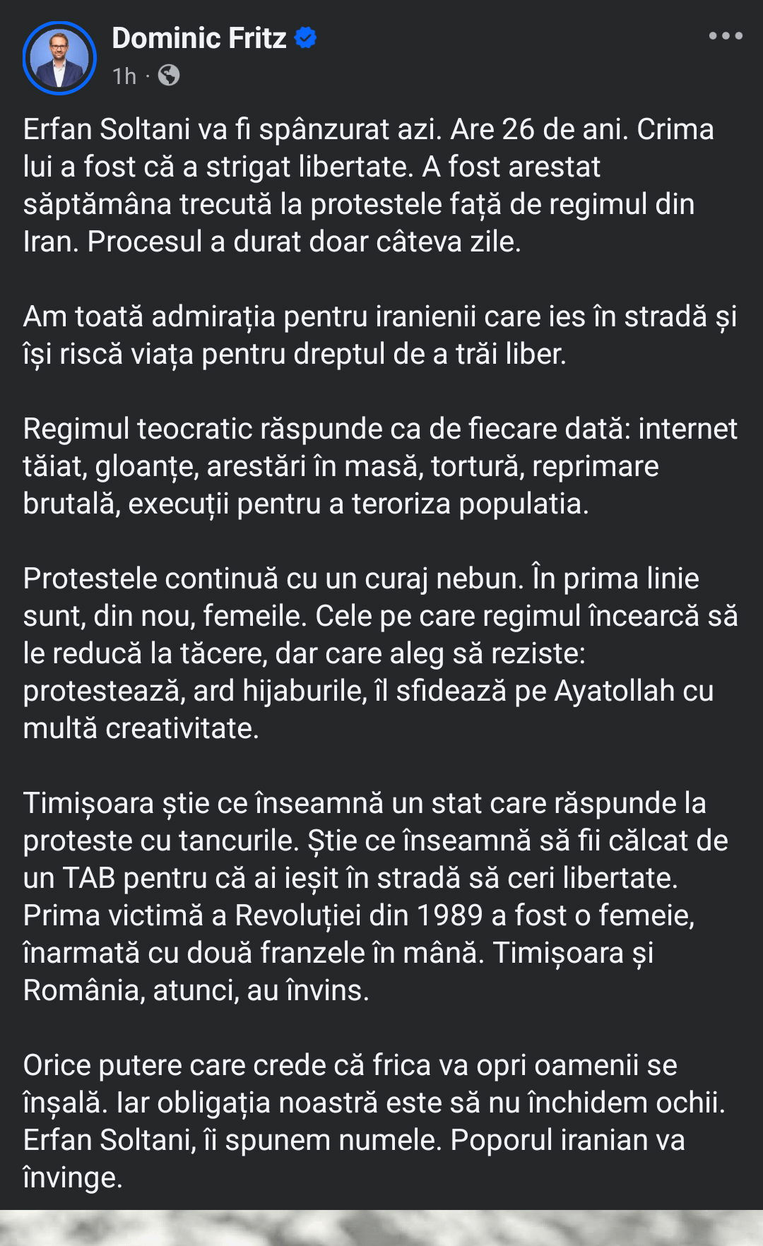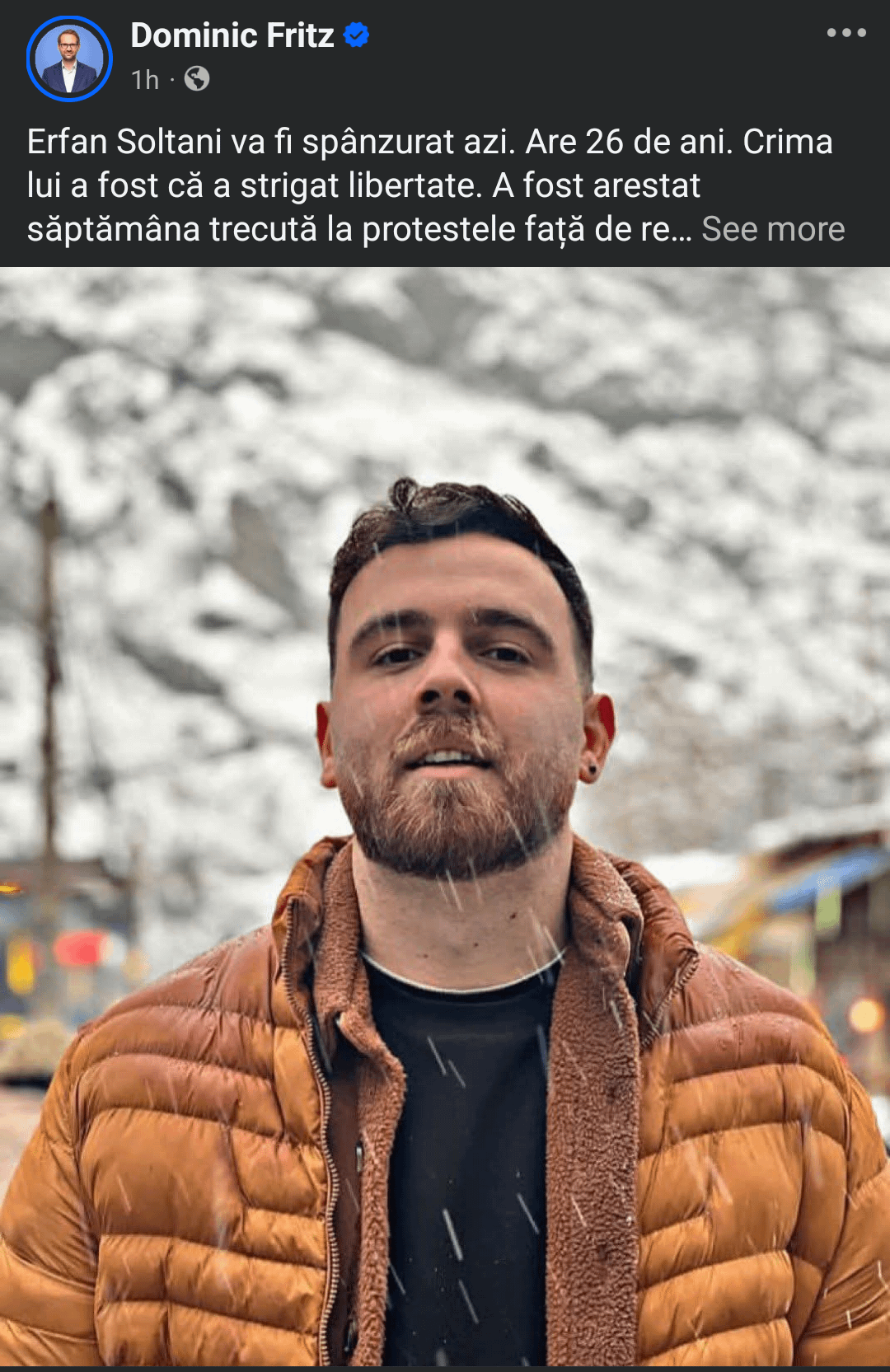 Fritz: Oggi Erfan Soltani verrà impiccato. Ha 26 anni. Il suo crimine è stato quello di aver invocato la libertà.