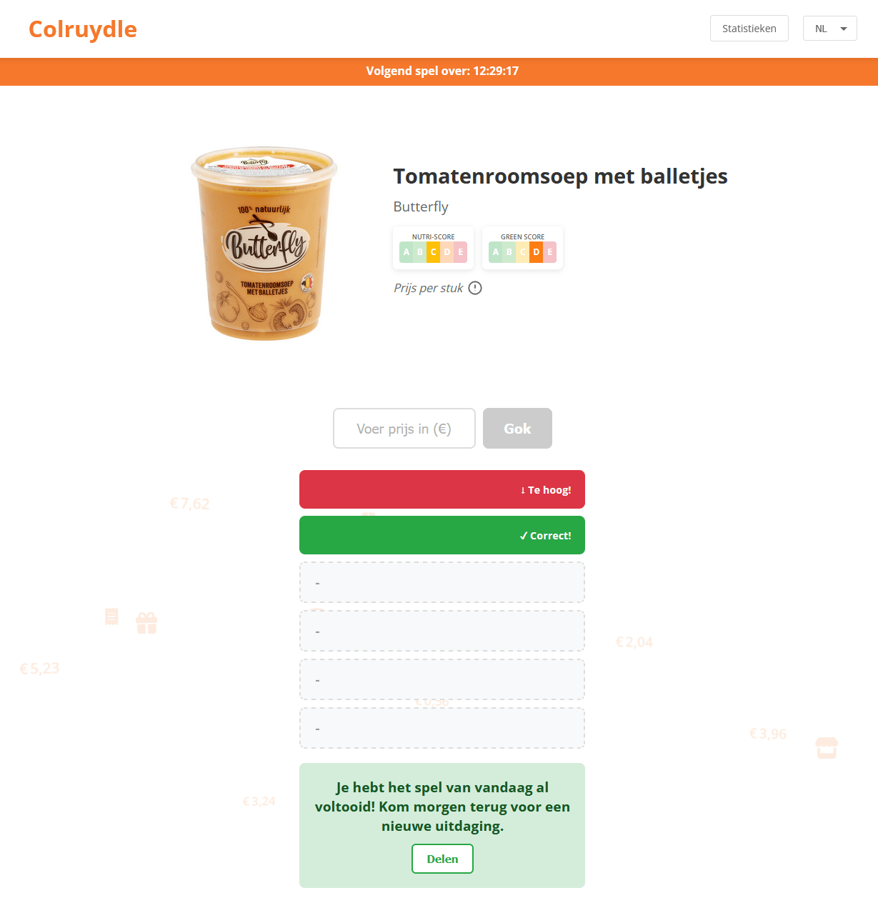 Je kan niet vals spelen. De search van Colruyt is zo slecht, dat je nooit kan vinden of het product nog maar bestaat, laat staan wat het kost.