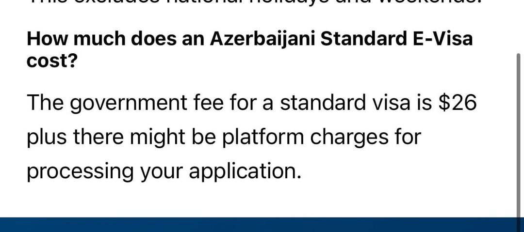 Ciao a tutti, sto programmando di andare presto in Azerbaigian ma quando faccio domanda per il visto sul sito dice che sono 69 dollari ma quando scorro verso il basso dicono che sono 26?? C’è un modo per ottenere quello da 26 dollari?
