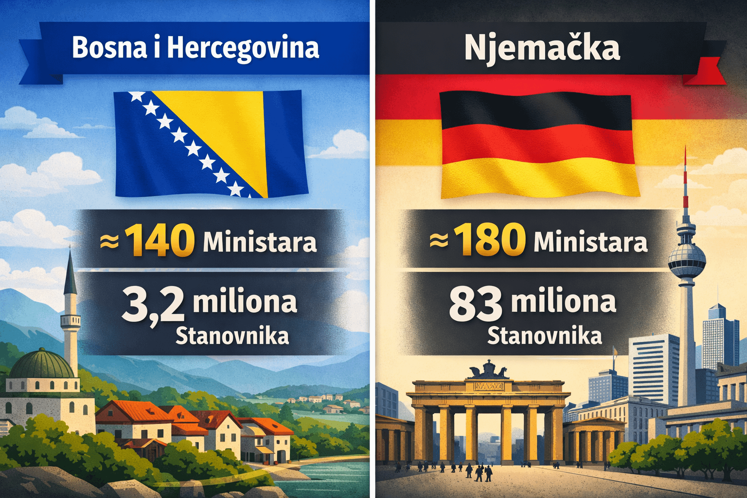 Sa ovih cca 140 ministara, javni sektor u BiH zapošljava 35% svih radnika. Da uvedeš npr. hrvatski stil administracije i smanjiš broj ministara na cca 20, javni sektor u BiH bi zapošljavao 35% svih radnika.