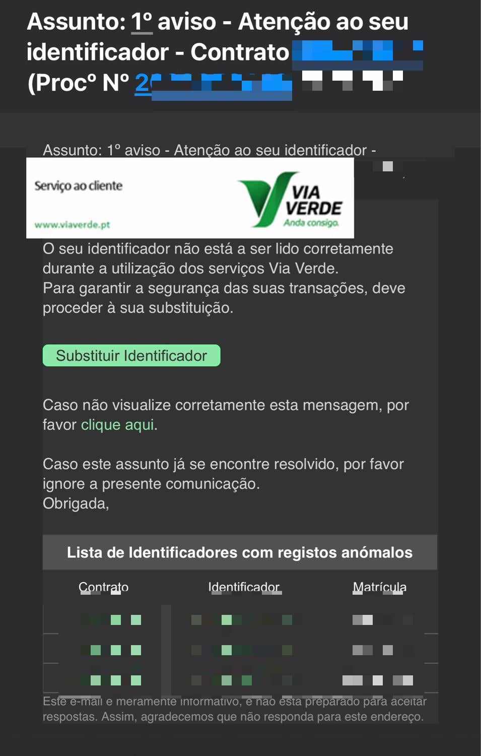 A partir de agora, vais começar a receber esses emails todas as semanas e, eventualmente, vão acabar por te desativar o modo dos parque de estacionamento. Ou seja, o identificador passa a servir apenas para SCUTs e portagens.