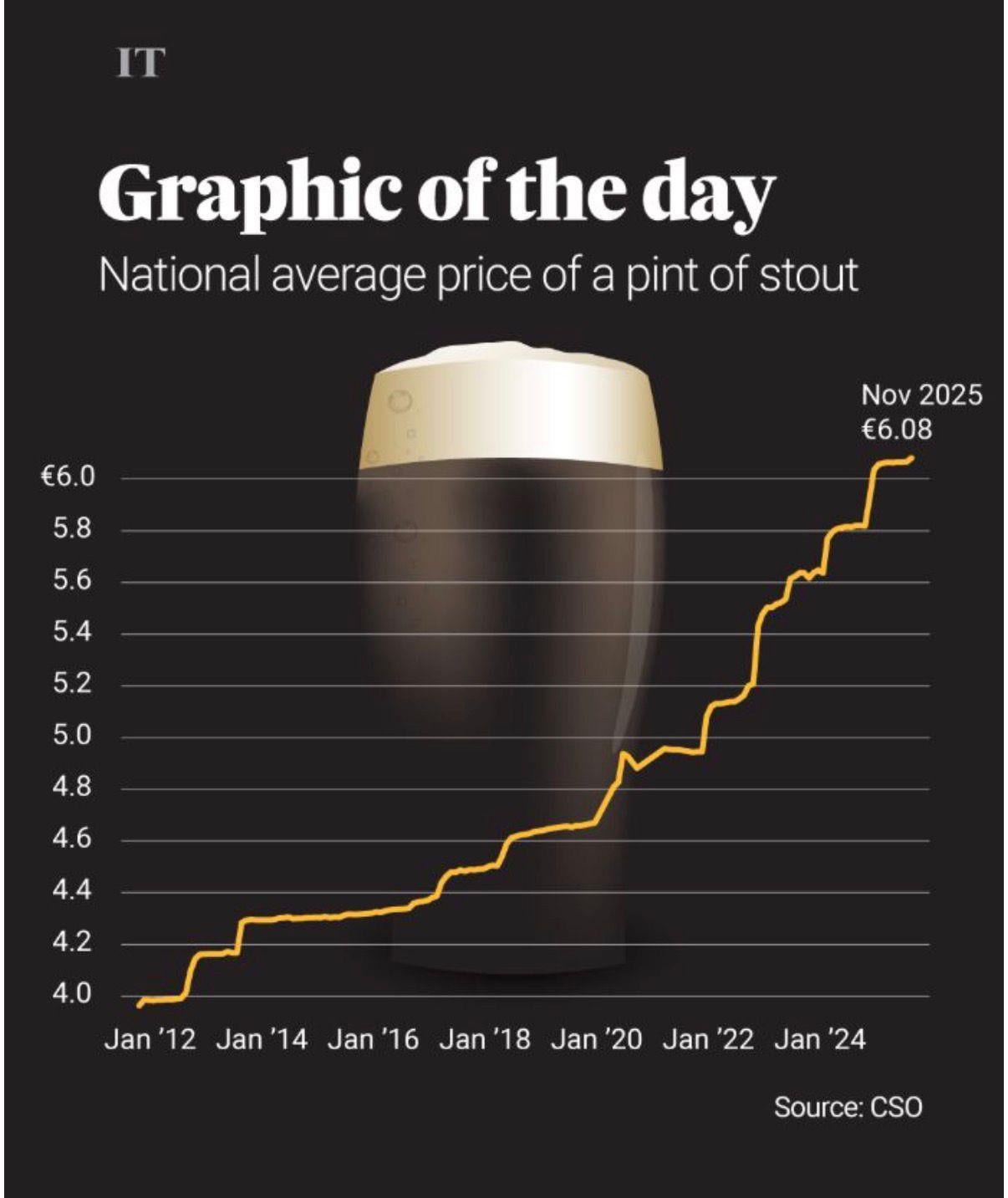 A pint in 2012 was around €4.00. A pint today is around €6.08.