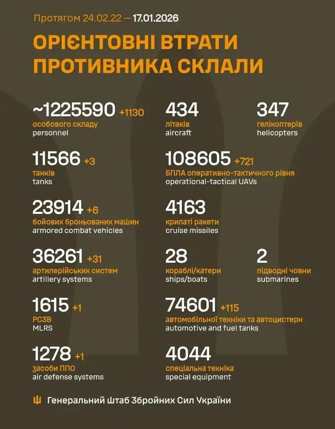 [Daily stats](https://www.reddit.com/r/RussianLosses/comments/1qf3v72/estimated_russian_losses_from_24022022_to/)