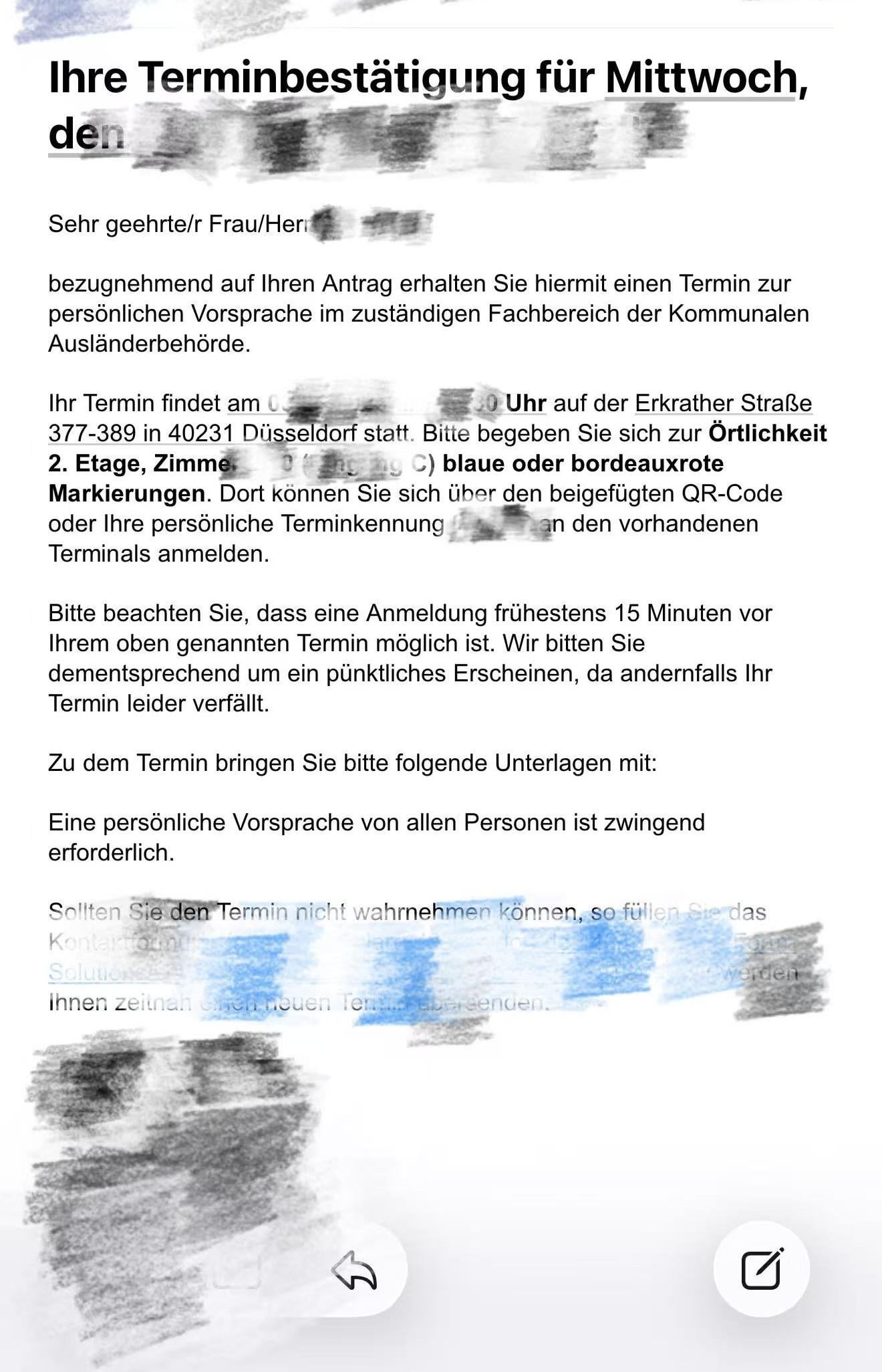 Ho ricevuto un’e-mail generata automaticamente dall’Ausländerbehörde di Düsseldorf che conferma il mio appuntamento (data, ora, luogo, informazioni sul check-in, ecc.).
