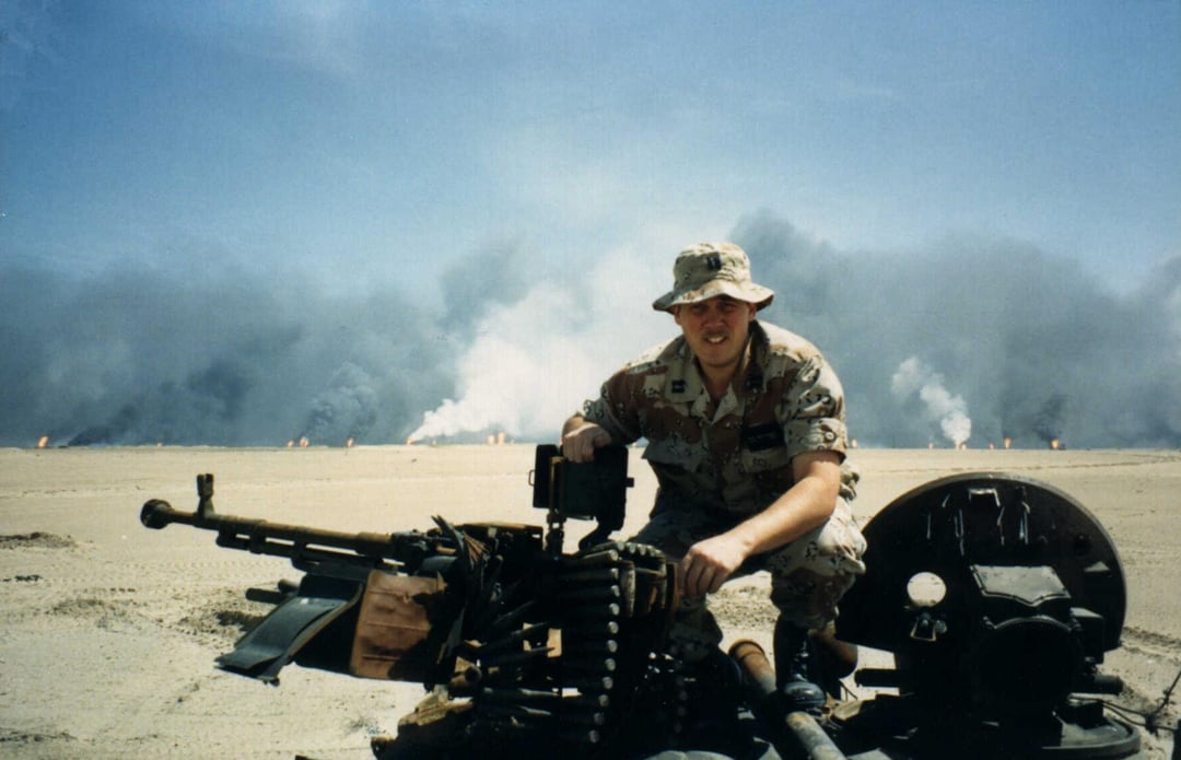 il Capitano Wayland Patterson del CENTAF siede sopra un T-72 iracheno distrutto nel Marzo del 1991,con dietro i pozzi in fiamme.
