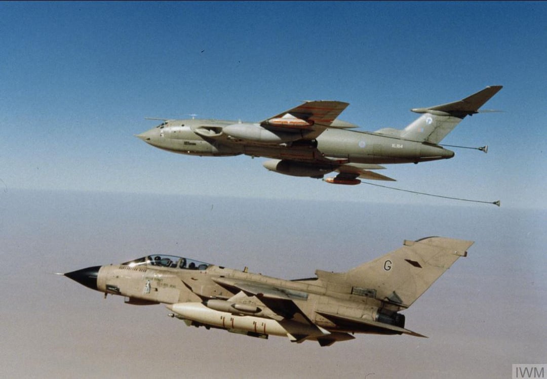 Un Tornado GR.1A (denominato G-Grannie)della RAF appartenente al 20° Squadrone in volo sopra l’Arabia Saudita,affiancato da un aerorifornitore Handley Page Victor. Data sconosciuta (probabilmente Gennaio 1991)