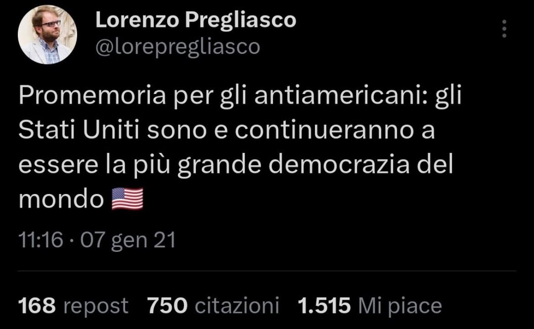 Complimenti a tutti i Parenzo che parlano sulle TV nazionali alle 10 di mattina ricordandoci di quanto gli stati uniti siano una grandissima democrazia “matura”.