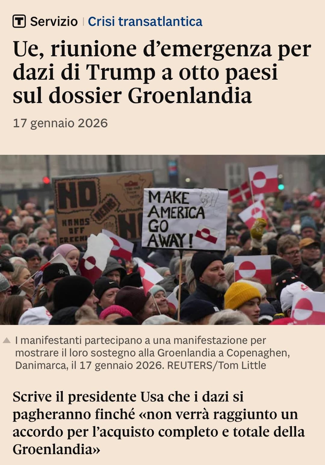 Qui c’è anche gente che sognerebbe le politiche fascistoidi trumpiane, da buon destropiteco che si rispetti, e non solo… mi tocca leggere Claudio Borghi della Lega che gode per i dazi agli altri paesi UE così “noi siamo più competitivi sul mercato USA” tanto della Groenlandia chi se ne frega? Non è mica meglio per loro essere parte della Danimarca. Qualcuno che la pensa in questo modo, può spiegare dettagliatamente perché la pensa così? Mi sforzerei di non offendere, ma almeno comprenderei meglio cosa si cela dietro certe mentalità dittatoriali e come queste si promuovono presso l’elettorato contemporaneo.