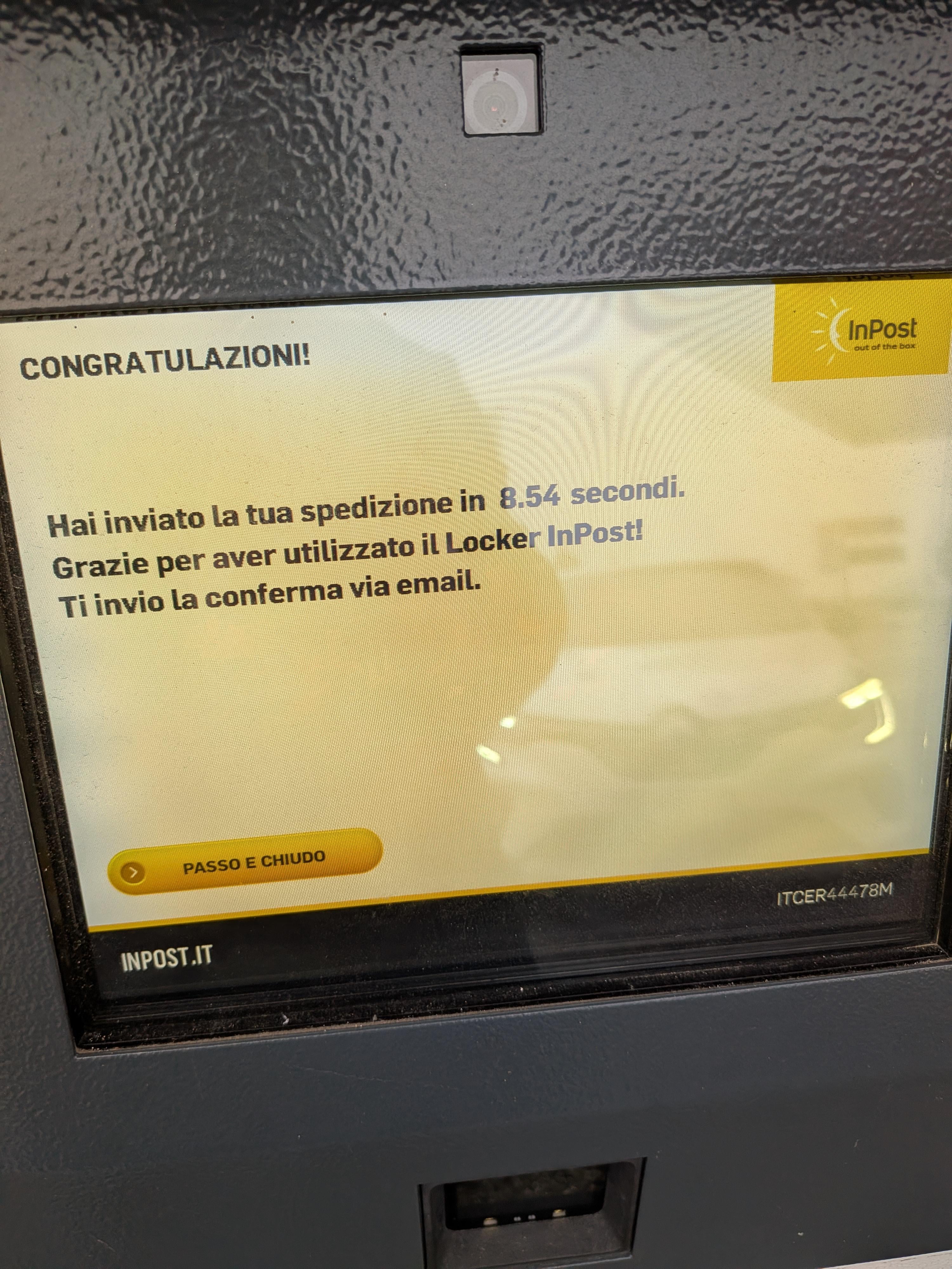 E con queste nuove abitudini, abbiamo imparato a riutilizzare pacchi, imballare, scotchare, etichettare. Tra le varie opzioni che i nostri compratori utilizzato per comprare il nostro usato c’è InPost i cui armadietti avrete sicuramente visto in giro anche ancora fate parte di coloro che la roba la va a buttare in discarica. Gli armadietti InPost (sembra un’adv, ma non lo è), permettono una procedura completamente automatica: scannerizzi il QR code dell’etichetta, selezioni il cassetto, inserisci il pacco e chiudi tutto. Alla fine, puoi scoprire quanti secondi ci hai messo.