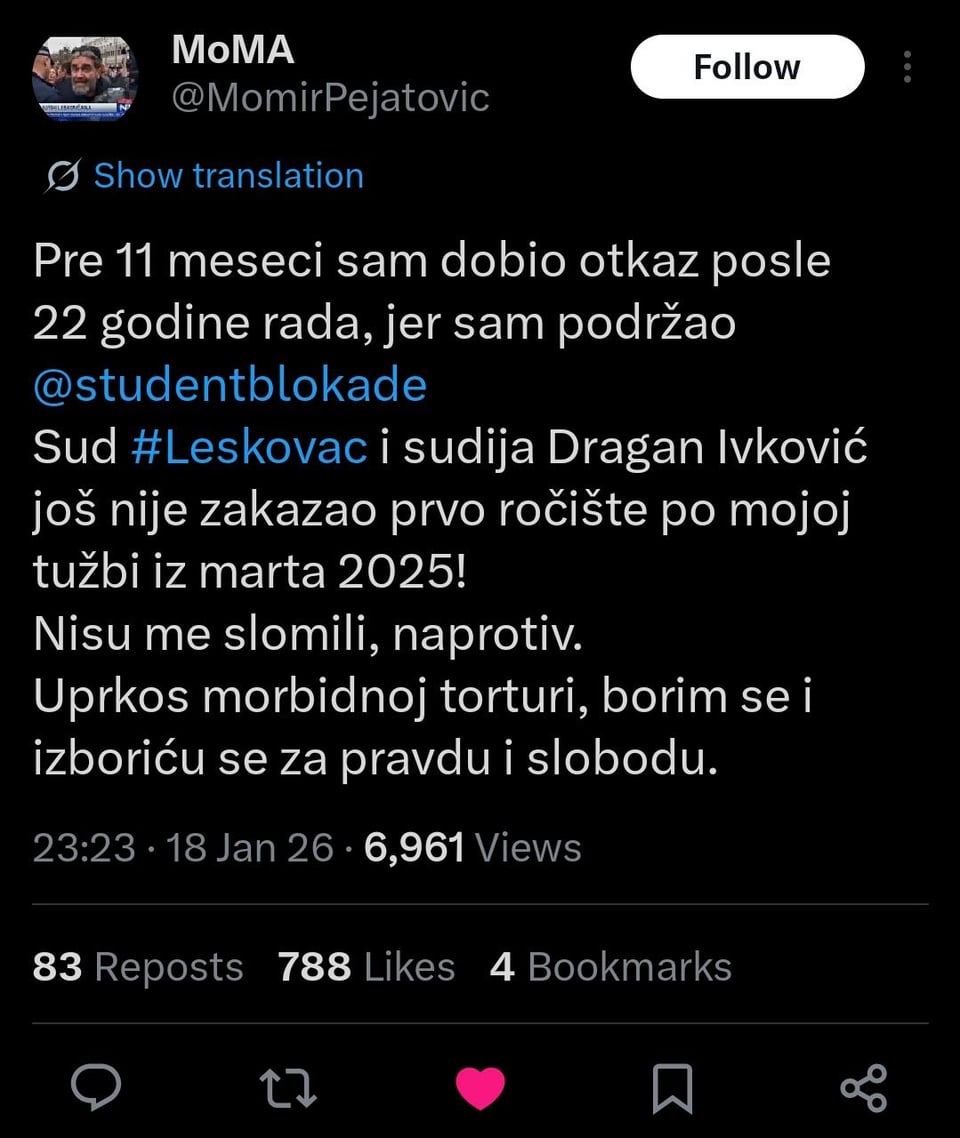 Ubeđen sam da će se to desiti kad ne budemo imali više išta da izgubimo, dok svaki izvor pijaće vode ne bude zatrovan u Srbiji, struje nestane u svakom domu, kad hrane gotovo ne bude više bilo u prodavnicama, i kad ne budemo mogli da priuštimo i to malo što ima, znači kraj krajnosti, jer nam je privid normalnosti draži od borbe za nju.