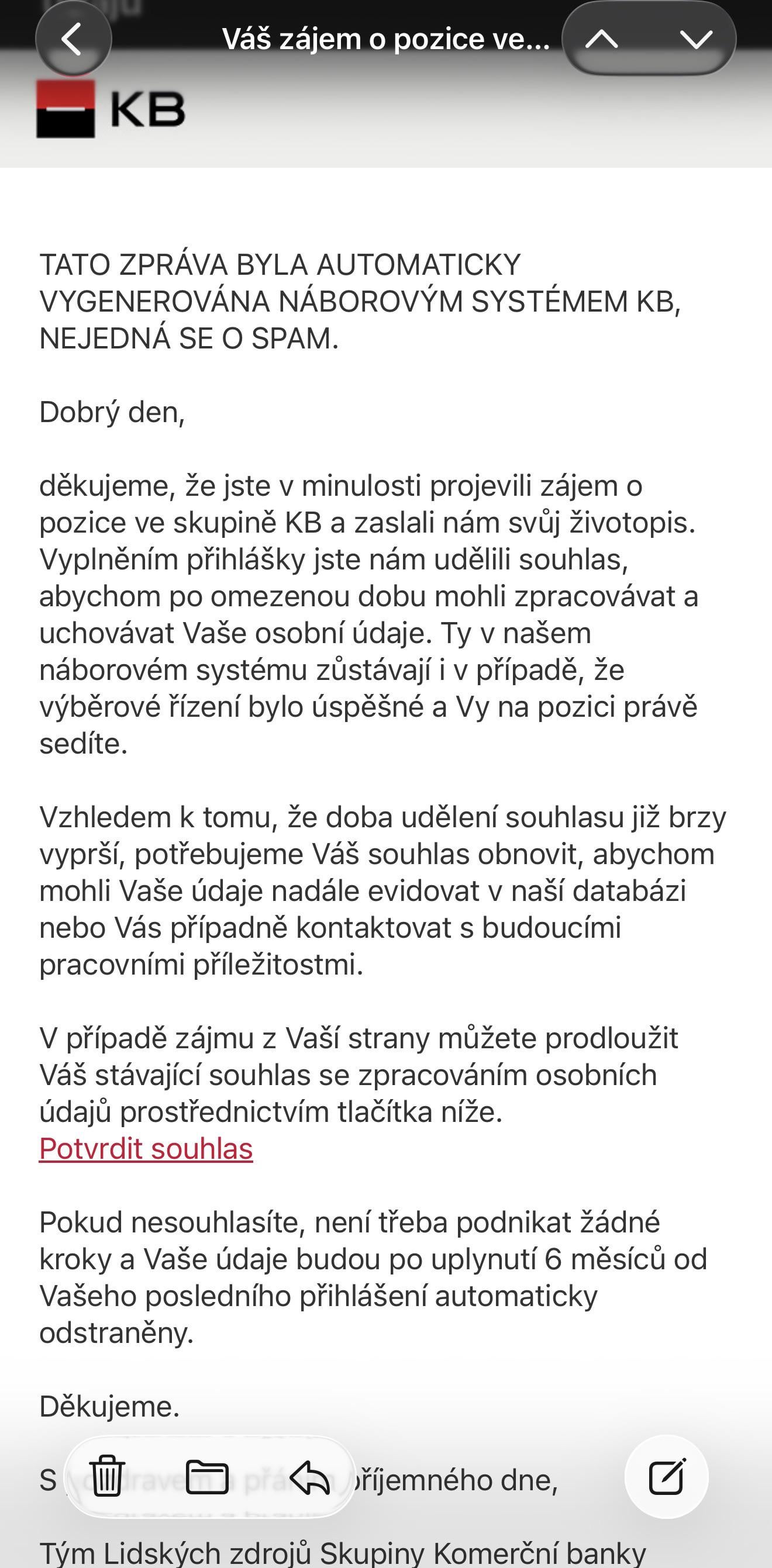Jsem z KB. Je sranda že mi tenhle email poslala KB na pracovní mail taky – na den přesně od momentu kdy jsem poprvé reagoval na inzerát.