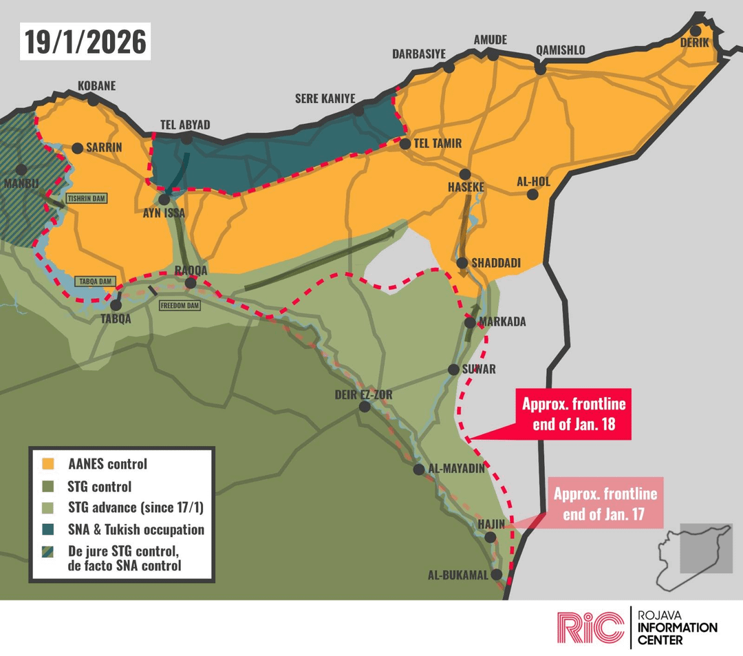 Una settimana fa, le truppe dello Stato Islamico in Siria hanno sconfitto le truppe delle Forze Democratiche Siriane (SDS) ad Aleppo. Pochi giorni fa le truppe dello Stato Islamico hanno attaccato il territorio del DASSVS. Le unità arabe dell’SDS hanno deciso di tradire l’SDS e unirsi allo Stato islamico siriano. L’esercito siriano ha liberato migliaia di prigionieri che erano membri dell’ISIS. Al momento, la SDS controlla solo i territori prevalentemente curdi. I combattimenti feroci continuano, ma le cose non sono buone per DASSVS e i residenti locali.