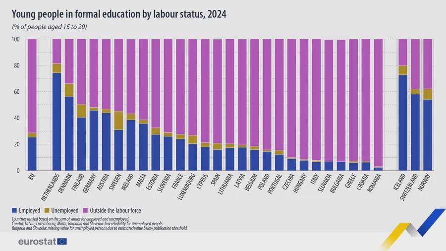 Atentie cum cititi graficul, sa nu credeti ca studentii nostri sunt niste putori, care ar trebui sa ia exemplu din alta parte. Nu e vorba acolo de studenti care muncesc in paralel. Orice forma de scoala e inclusa, de la scoli de ucenici pana la cursuri de calificare postuniversitare acreditate cu o diploma recunoscuta. Tine mai mult de cat de mult invata lumea intre 15-34 de ani, de oferta educationala si cat esti de motivat sa participi, nu de cat munceste. Se coreleaza destul de bine cu anii de studii pe care ii aduna, desi aici e vorba doar de educatia tertiara: