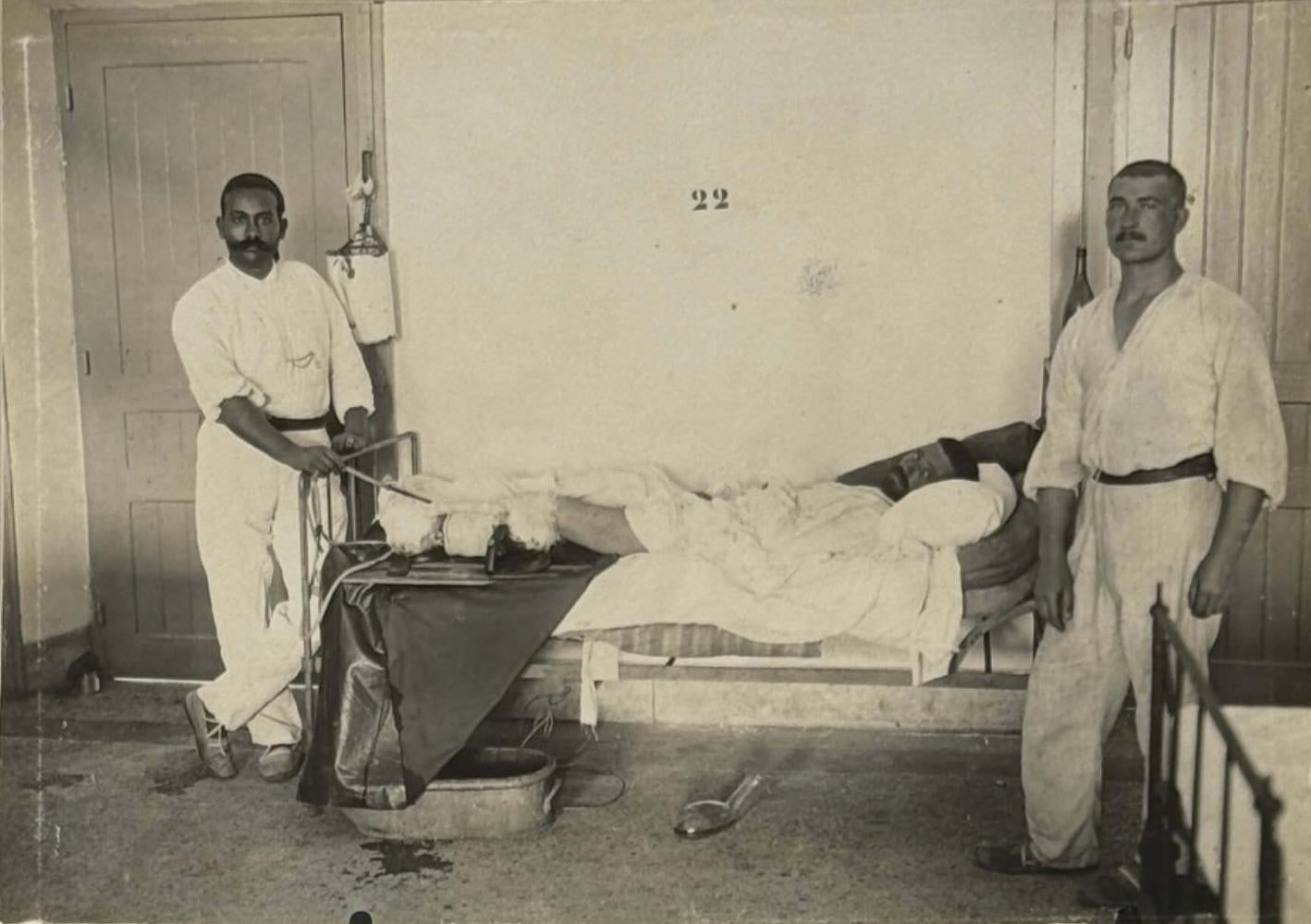 Questa rara fotografia vernacolare, scattata in giro 1916-1917mostra un soldato serbo in convalescenza all’ospedale militare serbo di Bisertasubendo quello che allora veniva descritto come irrigazione continua trattamento.