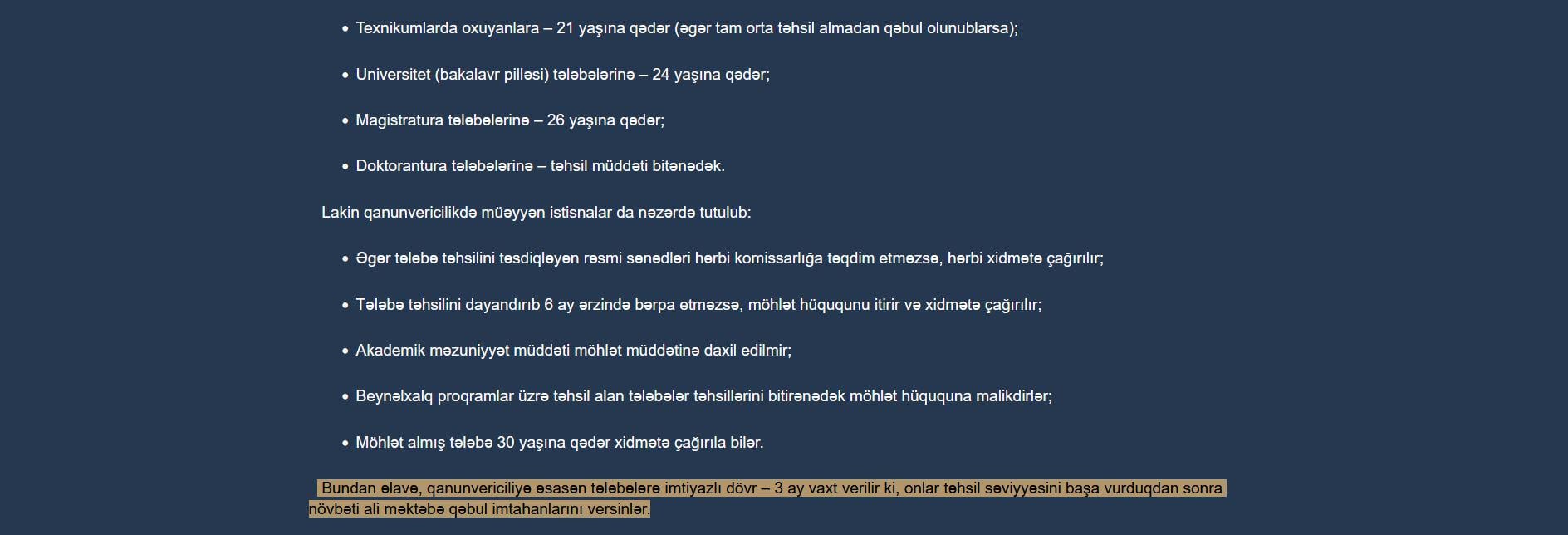 Ma ecco il problema: Quando ho finito la mia laurea in Turchia, voenkomat mi ha chiamato letteralmente subito dopo la laurea. Hanno completamente ignorato questa regola. Per farla breve, hanno chiesto 1500 AZN a "permettere" me quel ritardo di 3 mesi per potermi iscrivere al mio Master. Mio padre ha finito per pagarlo perché gli avevano fatto paura che avrei dovuto affrontare problemi legali quando fossi tornato in Azerbaigian, e l’intera faccenda è stata estremamente stressante per me. Ma allora né io né mio padre conoscevamo questa legge.