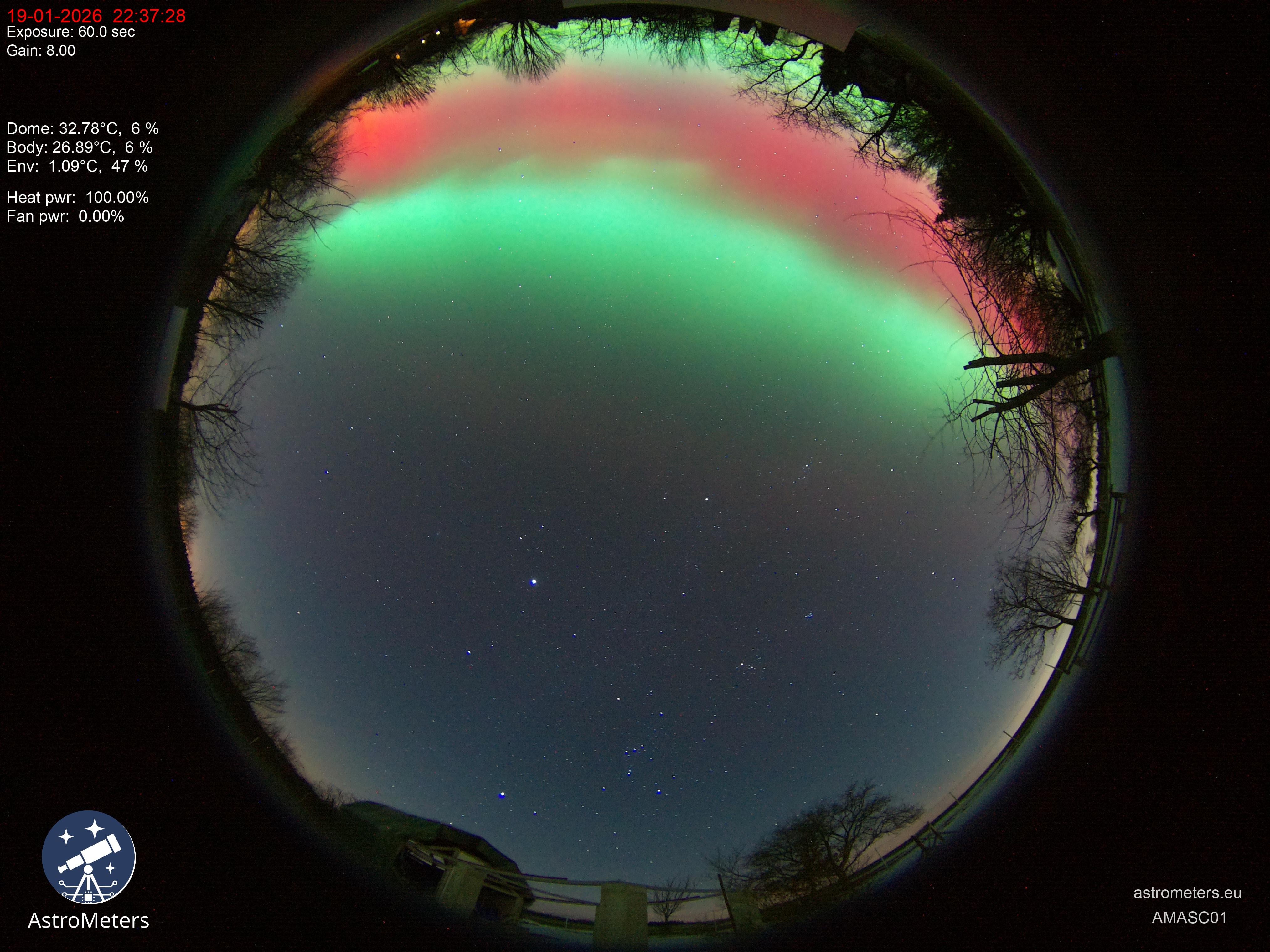 L’aurora boreale di oggi con la telecamera all-sky AMASC01 di Pardubice