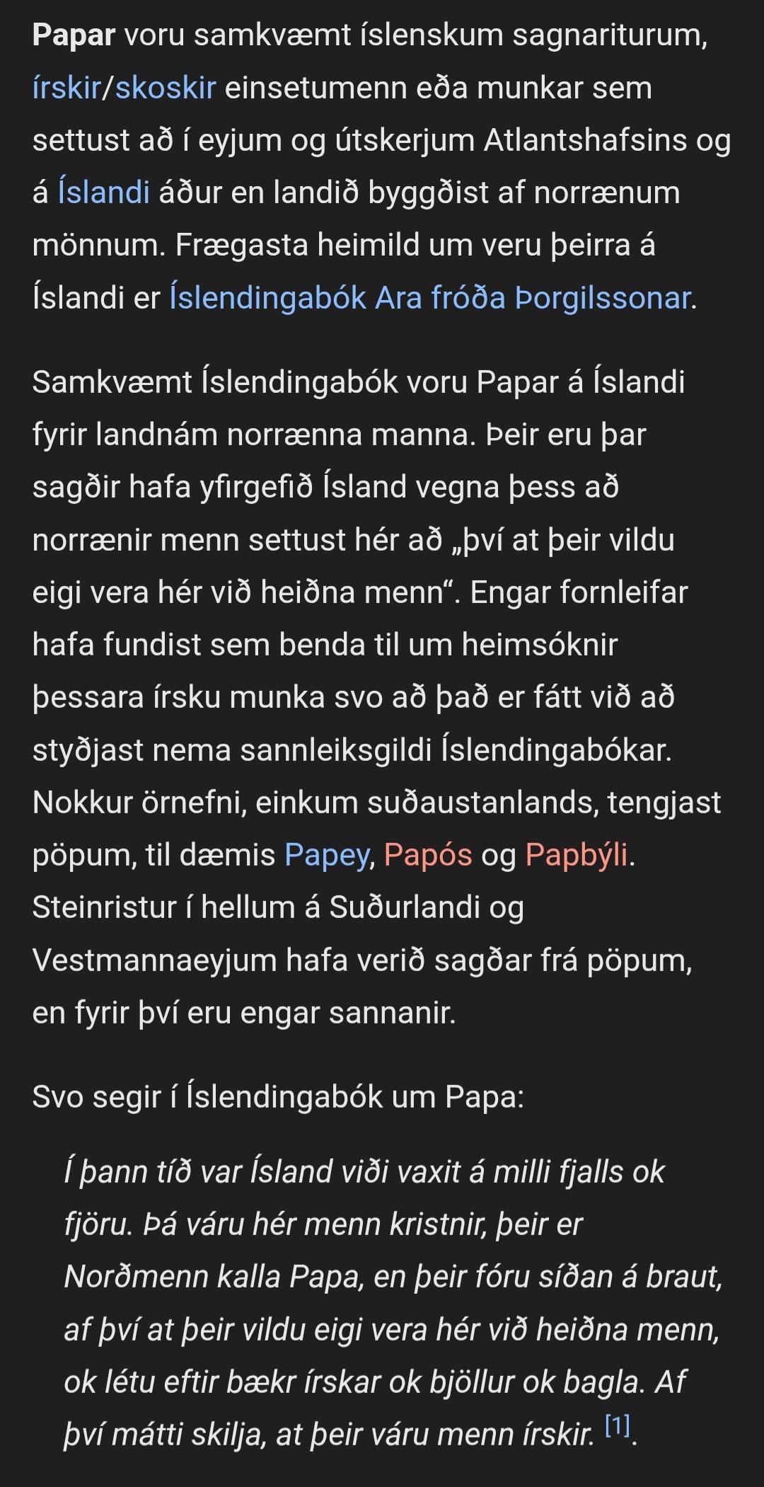 Ari Fródi trova campane su Papey più di 200 anni dopo l’insediamento e scrive che Papar era qui. Questo viene insegnato nelle scuole. Le registrazioni scritte a volte sono solide, ma se non ci sono altre prove, è abbastanza facile metterle in discussione.