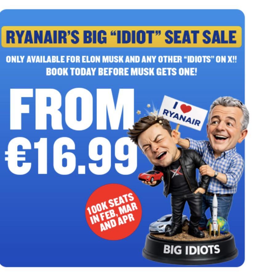 Half the world is about to read about the 16.99 flights on the news for free. MOL is brilliant at his job! Elon has no idea he’s being played as a marketing stunt.