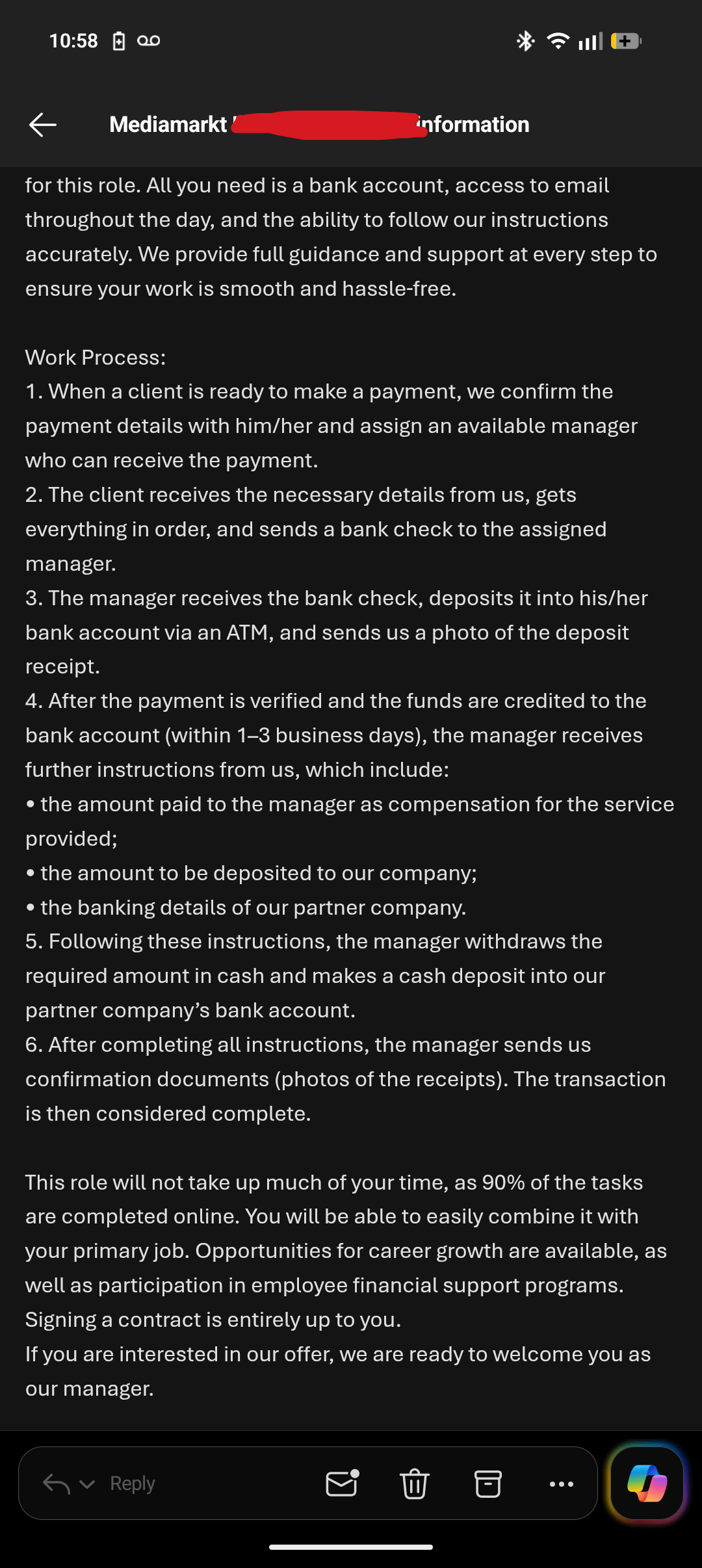 Non vengo dalla Germania ma lavoro con MediaMarkt ormai da alcuni giorni e mi sembra un lavoro decente. Dopo un paio di segnali d’allarme ho deciso di andare su Internet, dove ho trovato tutti voi che li derubavate di qualità e servizio clienti discutibili. Ecco un’e-mail che ho ricevuto che descrive il mio "nuove responsabilità lavorative." Mi sembra terribile come il riciclaggio. Cosa ne pensate?