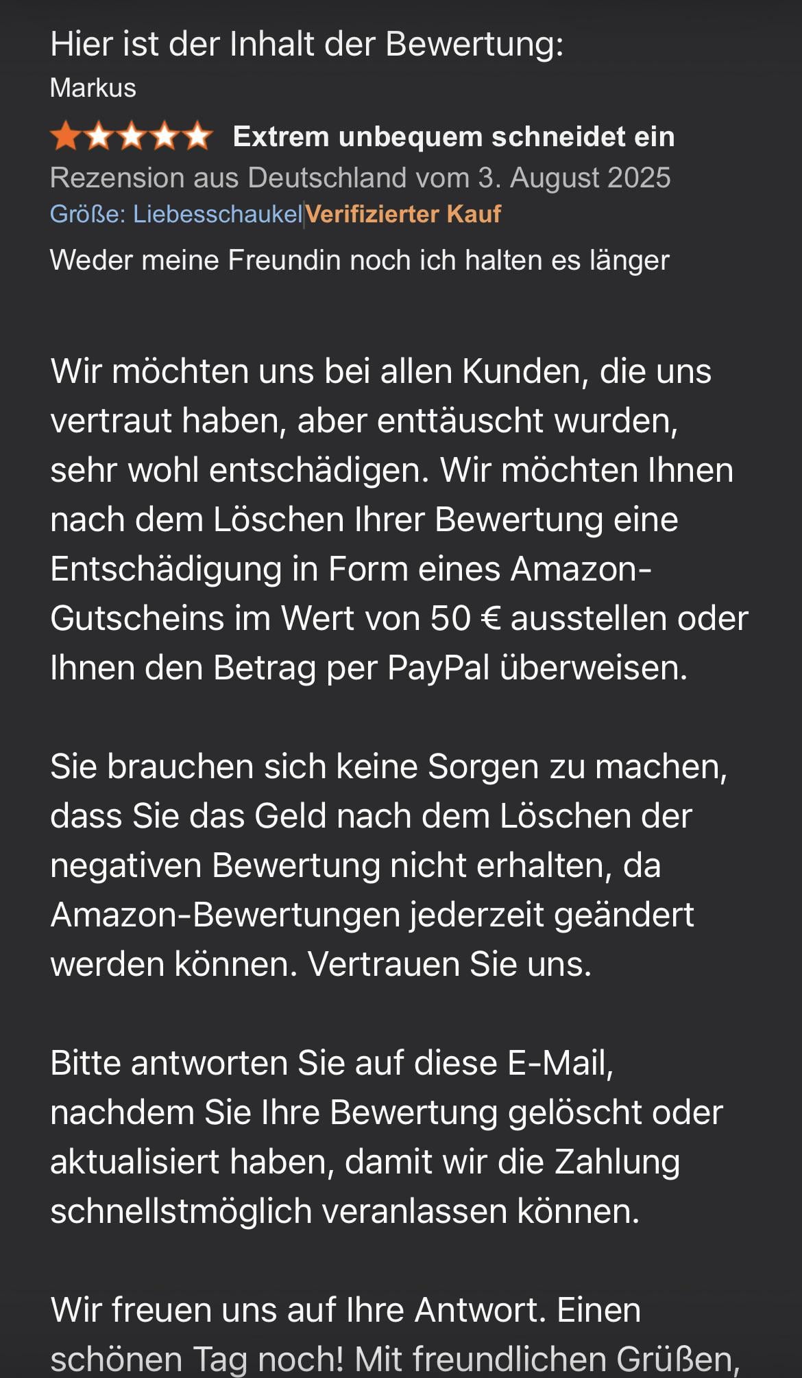 Melde den “Umstimmungsversuch” bei Amazon, die sehen so betrügerisches Verhalten gar nicht gerne. Solche Shops gehören weg.