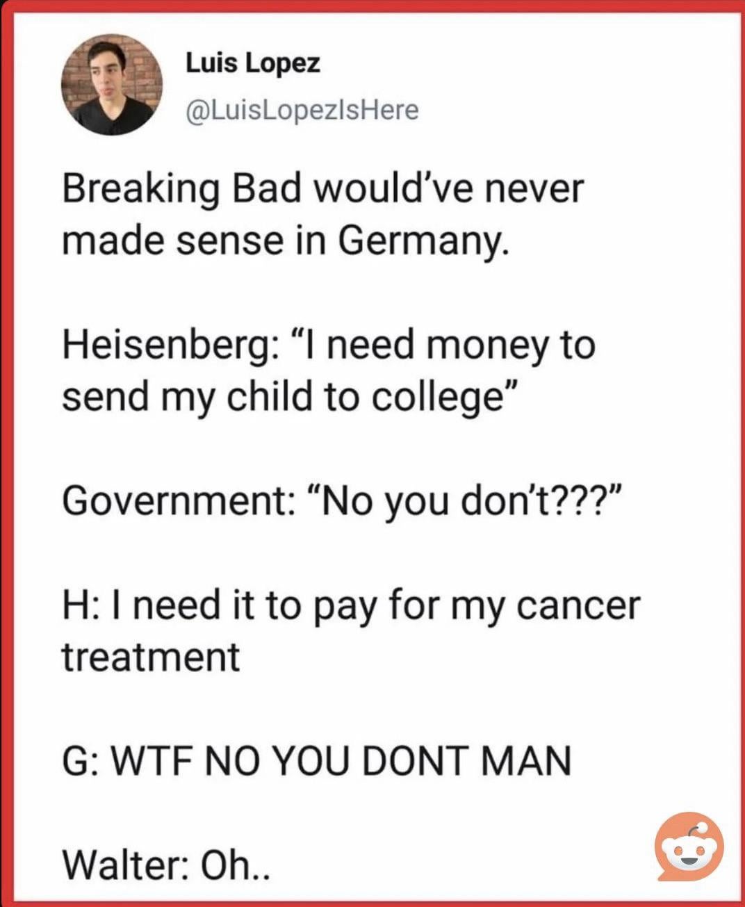 This is even funnier because Heisenberg is a teacher. And as we all know, most teachers in Germany are Beamte, who usually have excellent health insurance.