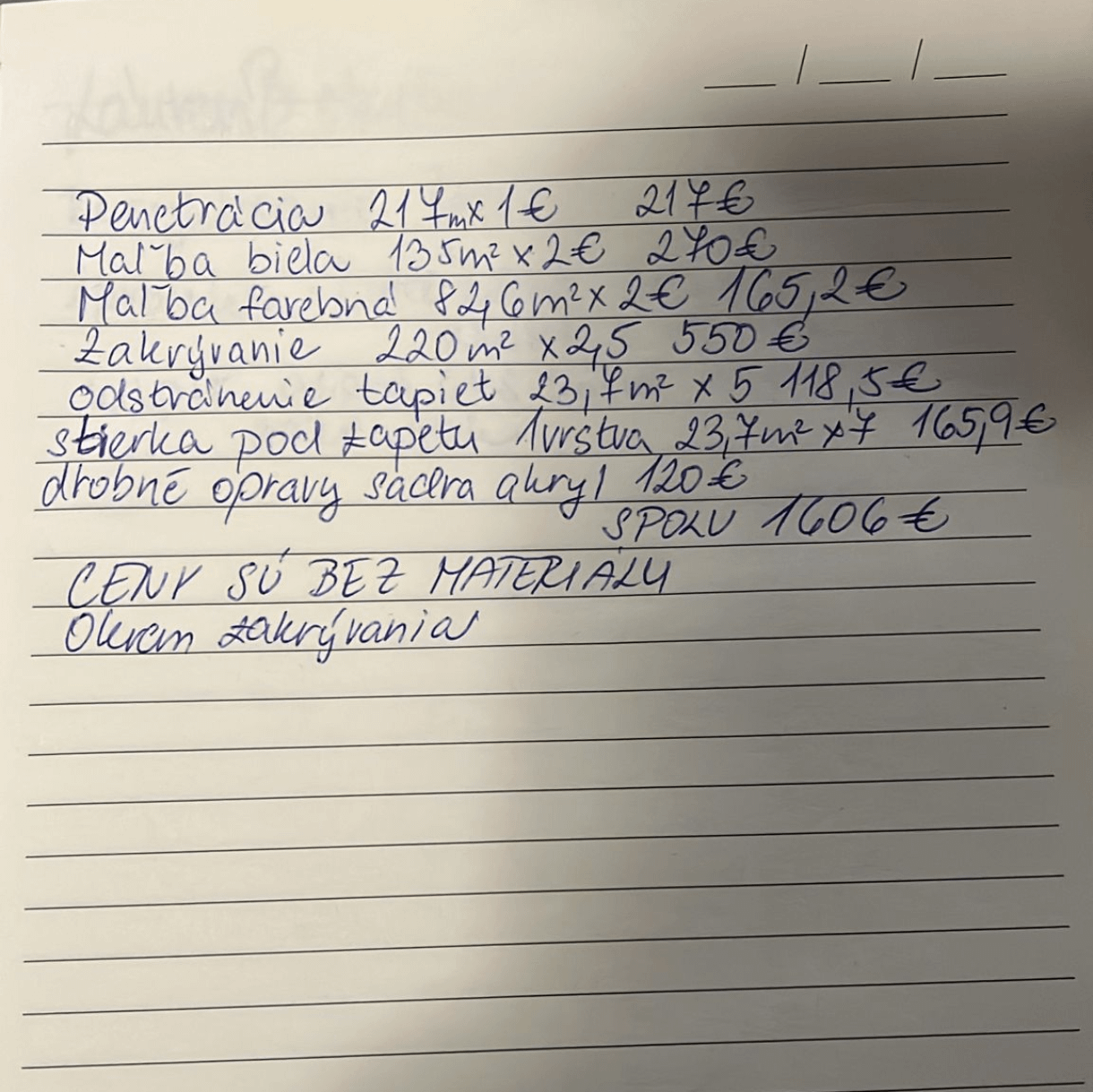 Platil som 1200eur aj s materialom keď mi vymalovali celý dom(okolo 95m2) , obycajna biela farba + zopár vecí opravili čo bolo treba , ale to bol minulý rok a bez dph